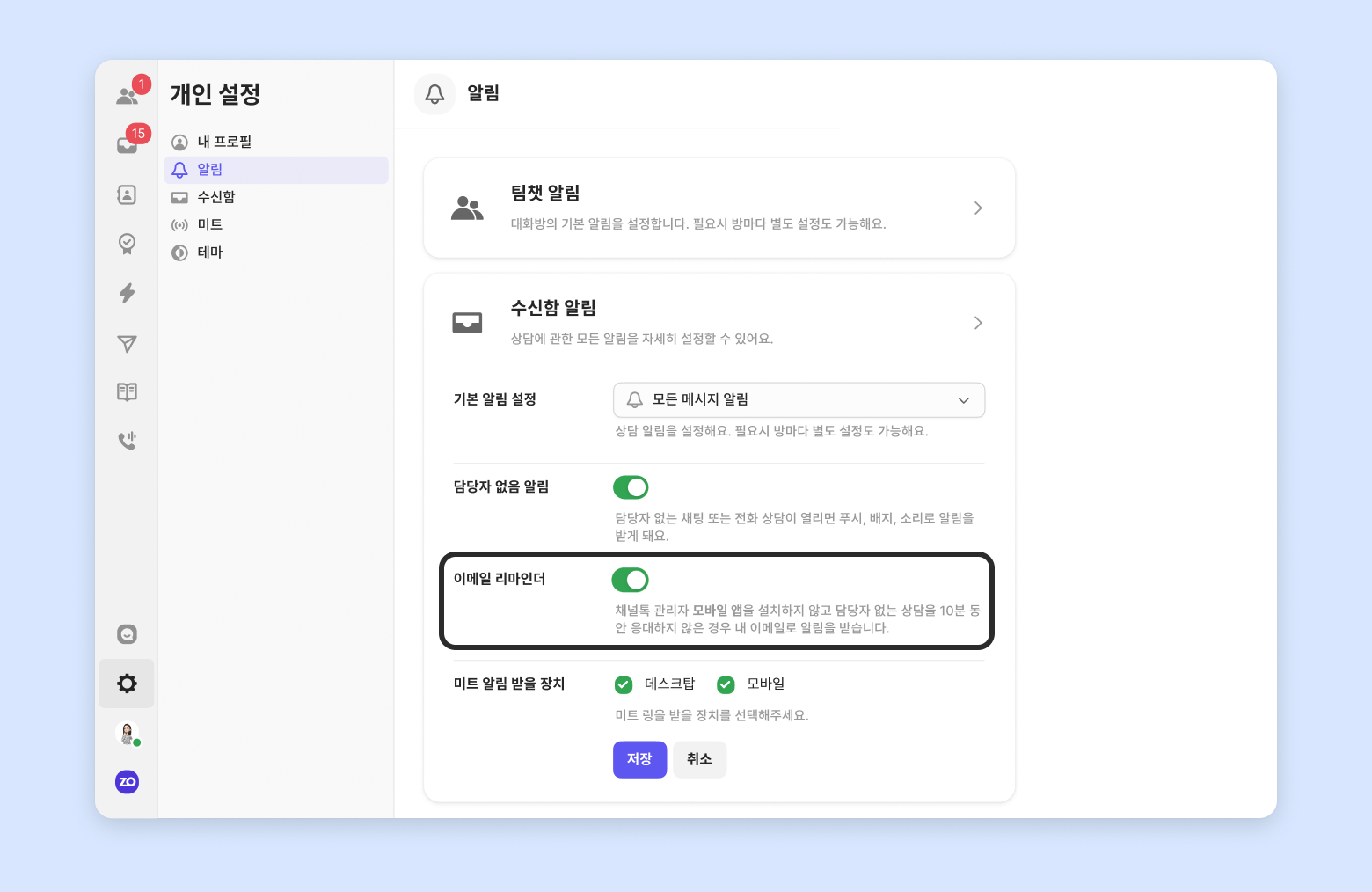 모바일 앱을 설치하지 않았거나 담당자 없는 상담을 10분 동안 응대하지 않은 경우 내 이메일로 알림을 받아보세요. (담당자 없음 알림을 켜야만, 이메일 리마인더도 켤 수 있어요.)