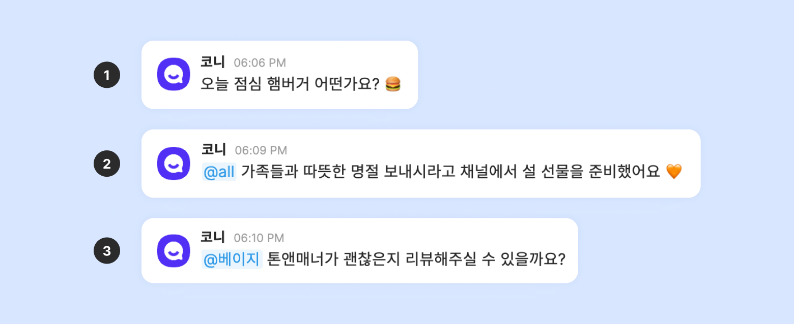 일반 메시지: 멤버를 특정하지 않고 보내는 메시지 및 팀 멘션 메시지