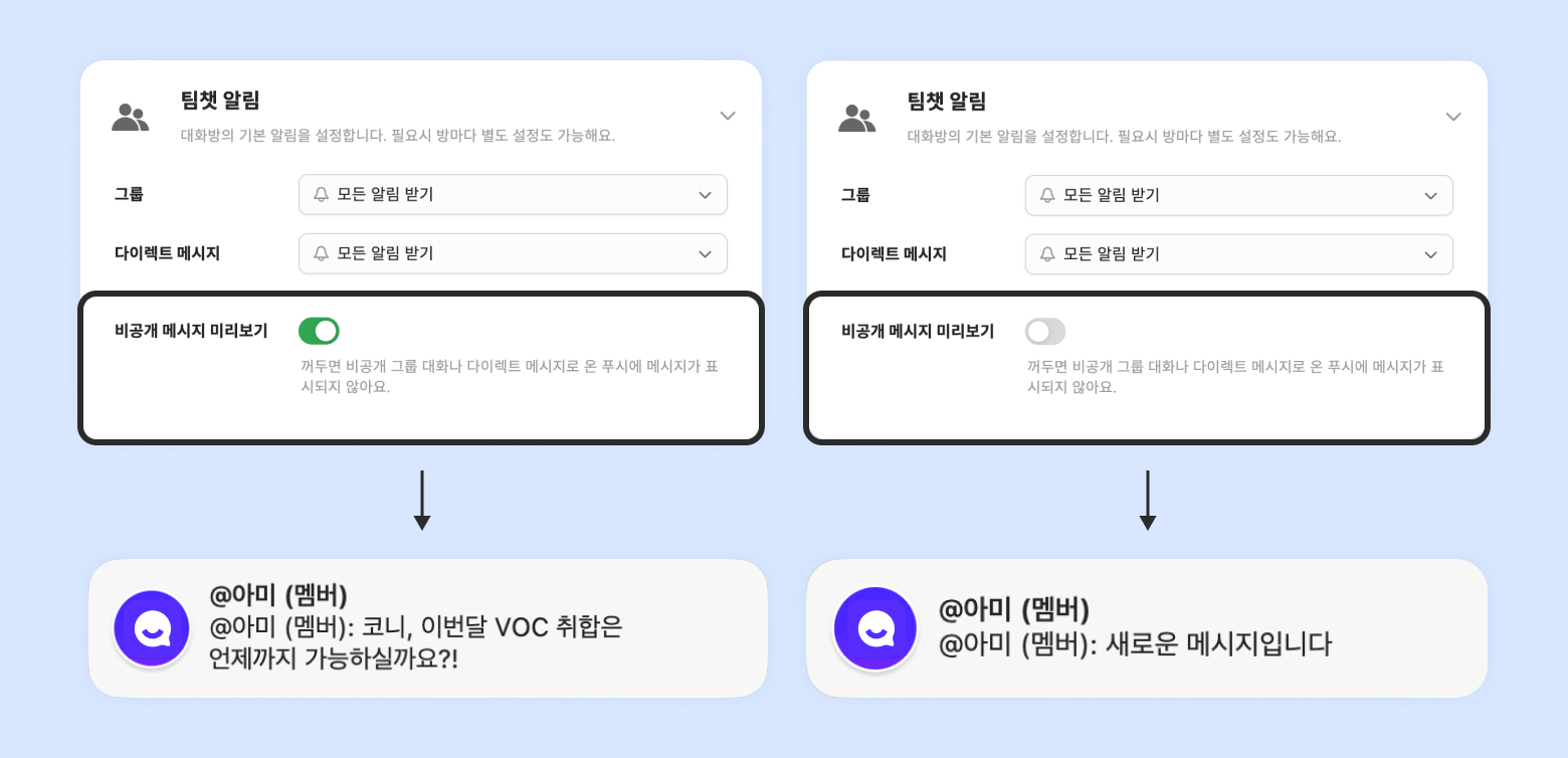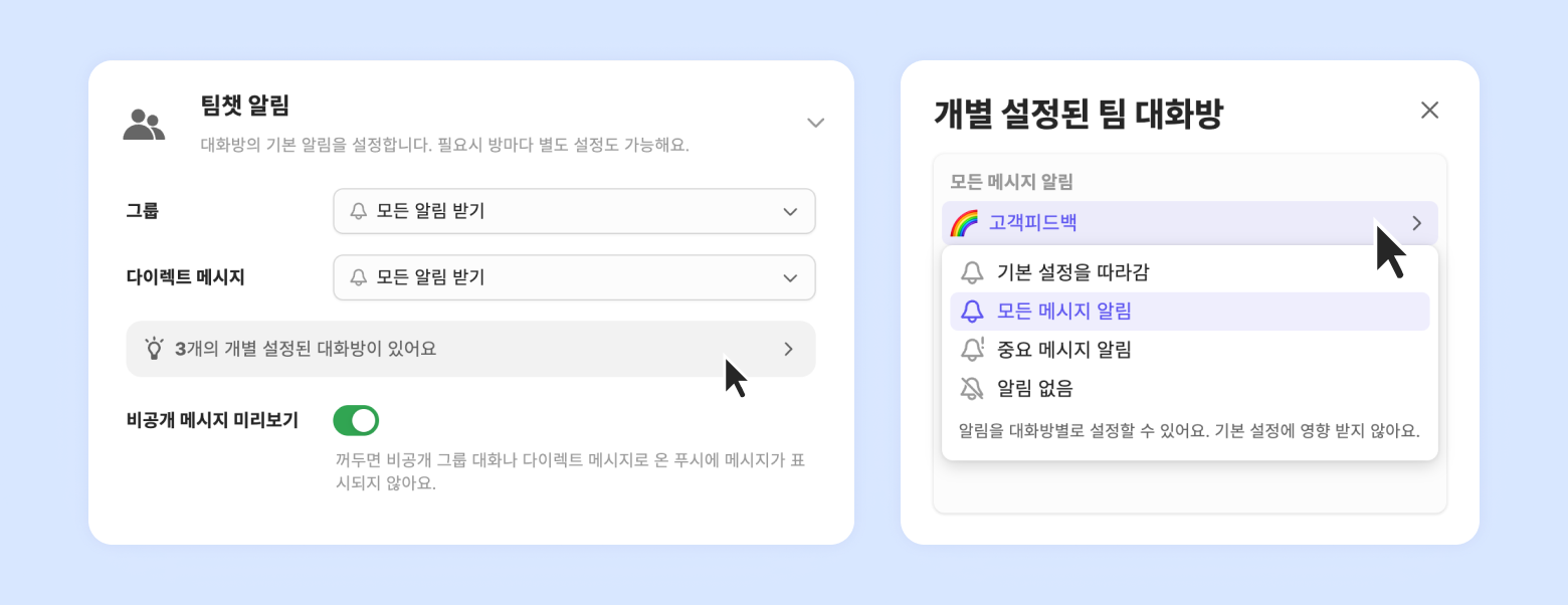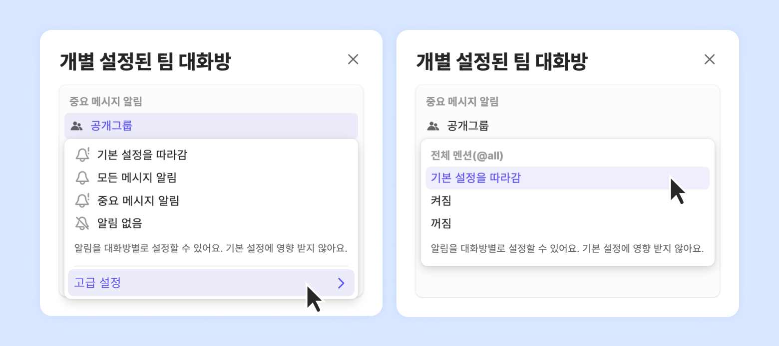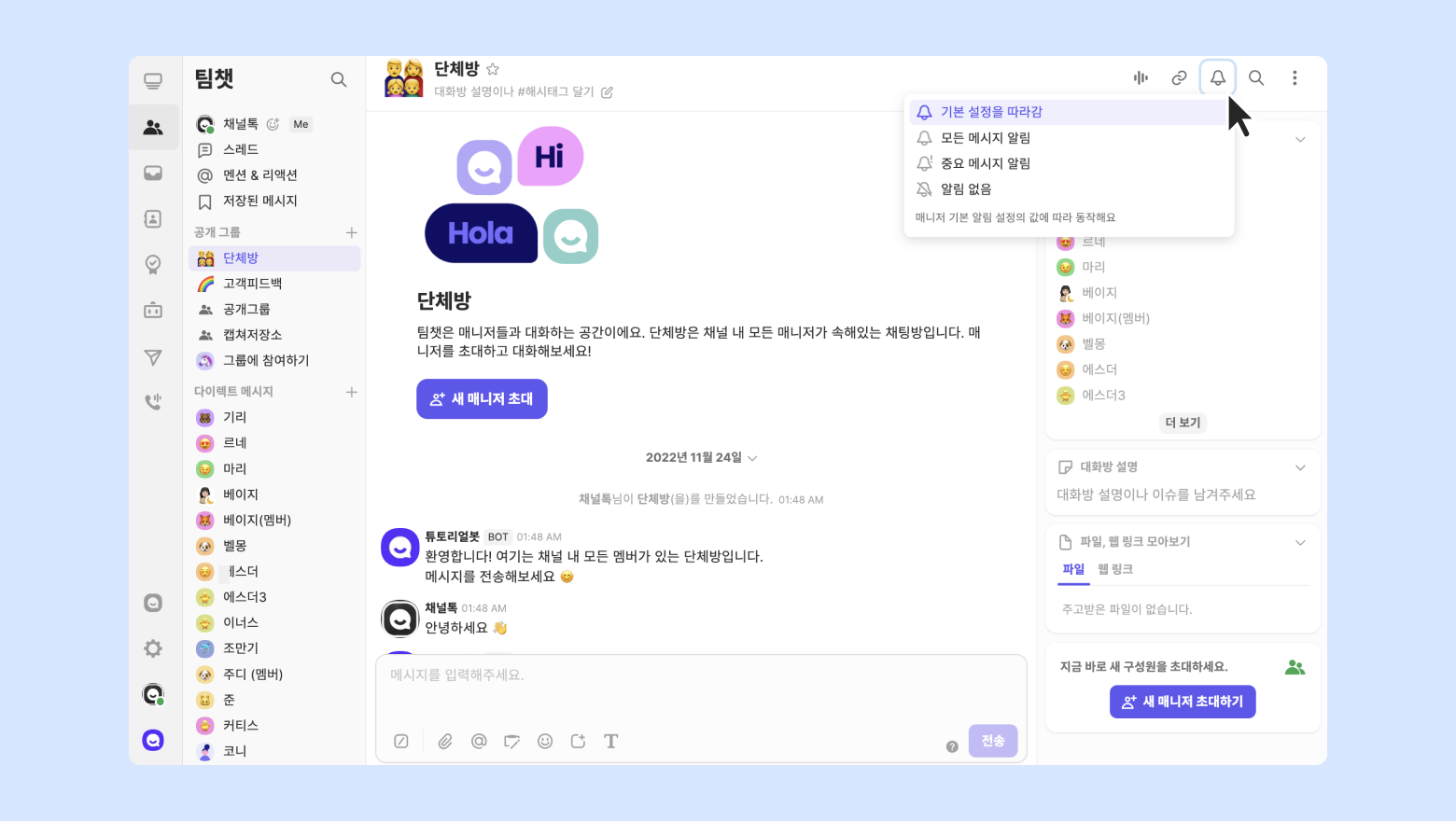 팀챗 내 대화방의 기본 알림을 설정할 수 있어요. 필요 시 그룹방 마다 개별 설정도 가능해요.