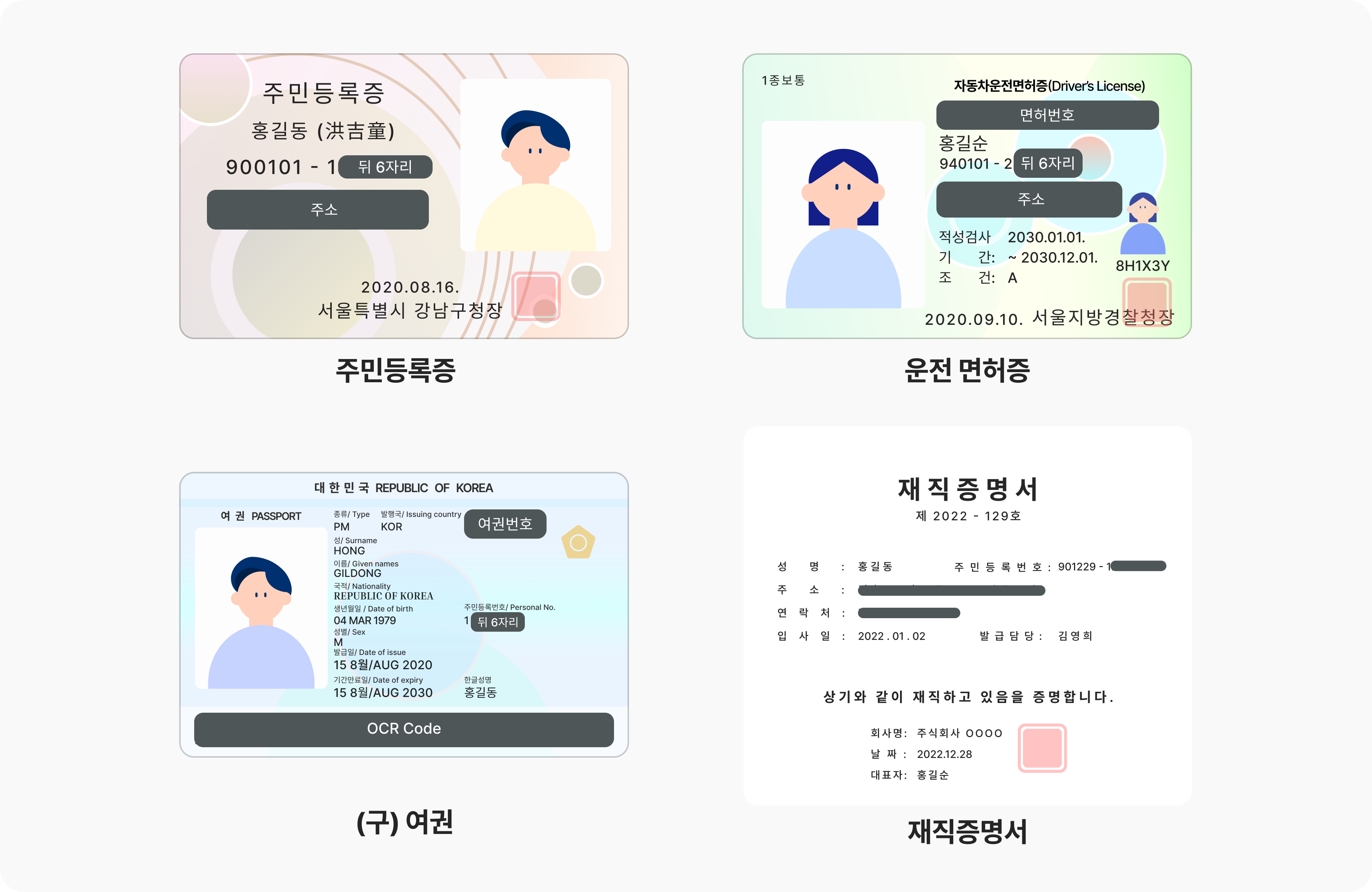 신분증에 따라, 개인 정보 항목이 다르기에 아래 예시를 참고하여 마스킹을 진행해주세요. 이름, 생년월일, 성별, 발급 기관 (기관명, 날인) 정보를 제외한 나머지 정보는 꼭 마스킹 처리 후 첨부해주세요.