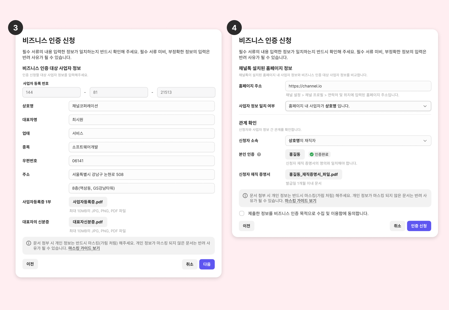 본인 인증이 완료되면 채널톡에서 비즈니스 승인 서류를 입력하신 주소로 발송합니다.