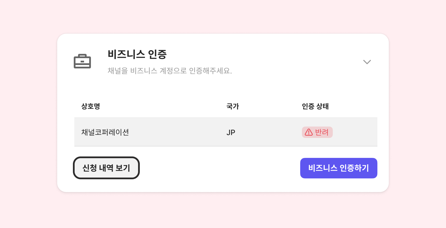 [신청 내역 보기] 를 통해, 비즈니스 인증 진행 상황 및 신청자를 확인할 수 있어요. 검수 반려 시, 반려 사유도 확인이 가능합니다.