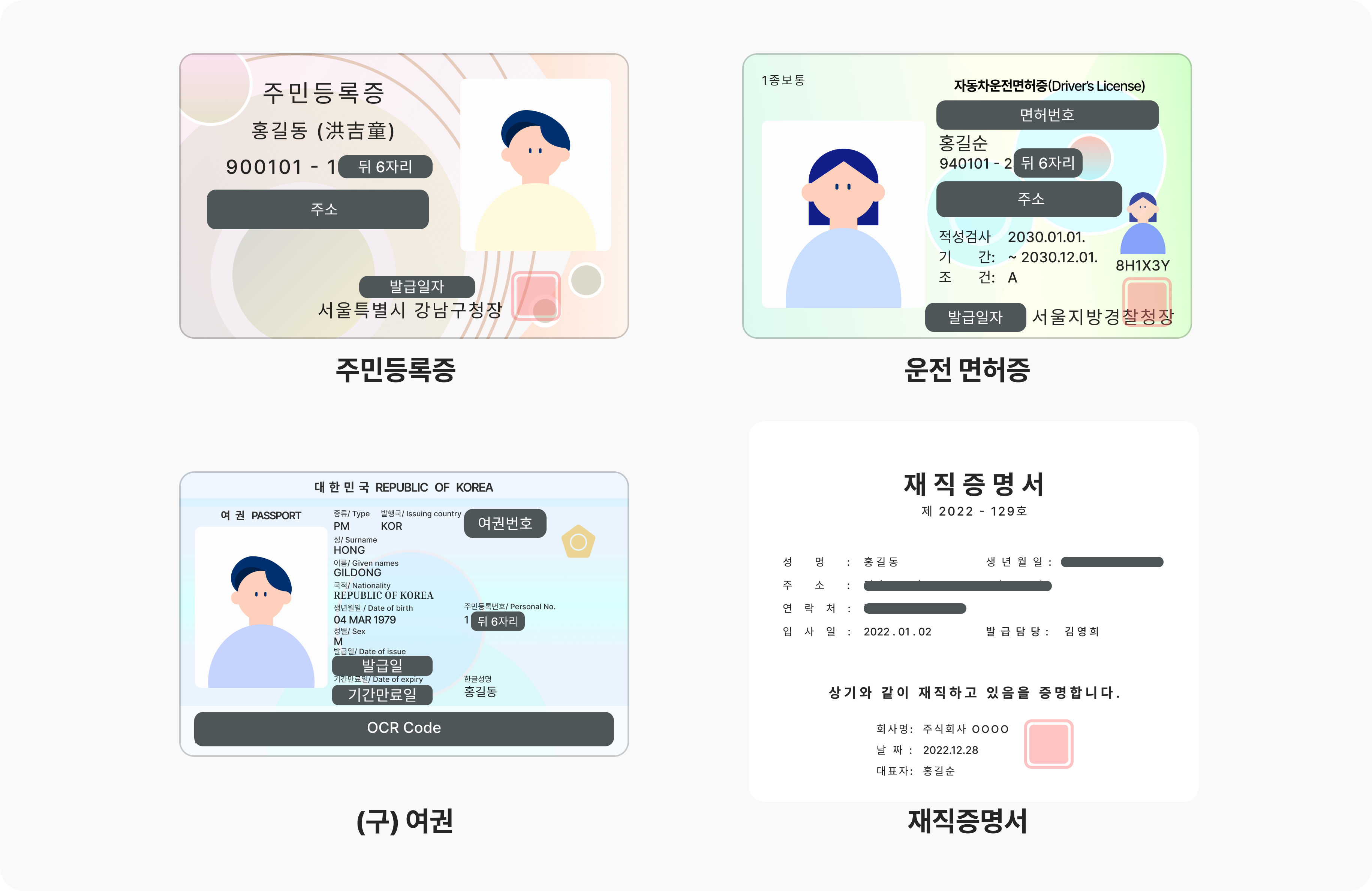 신분증에 따라, 개인 정보 항목이 다르기에 아래 예시를 참고하여 마스킹을 진행해주세요. 이름, 생년월일, 성별, 발급 기관 (기관명, 날인) 정보를 제외한 나머지 정보는 꼭 마스킹 처리 후 첨부해주세요.