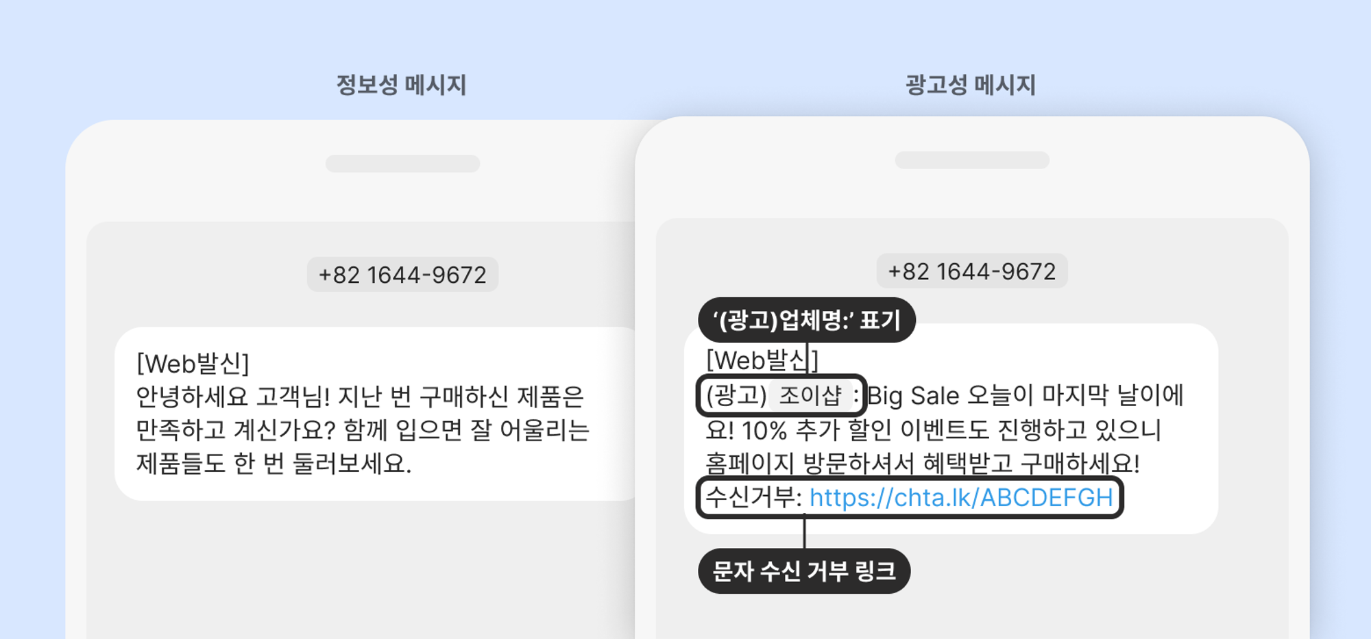 • 영업하는 자가 고객에게 단순 정보 전달만을 목적으로 하는 경우를 제외하고, 영리 목적으로 광고성 정보를 포함한 메시지입니다.