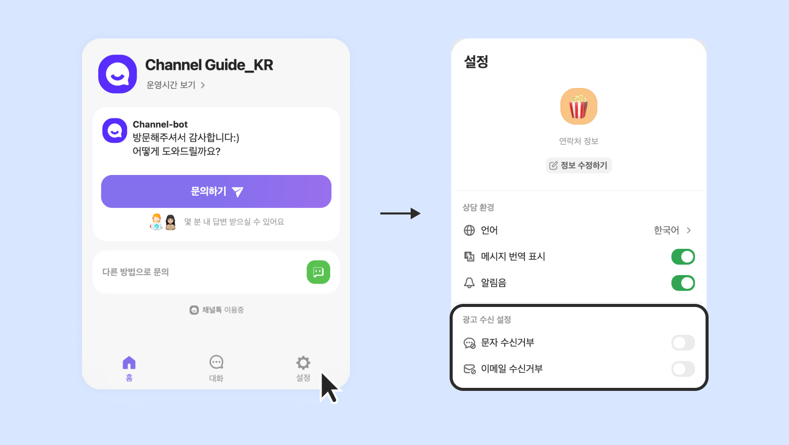 • 채널톡의 정보성 메시지는 수신거부와 관계없이 항상 발송됩니다.