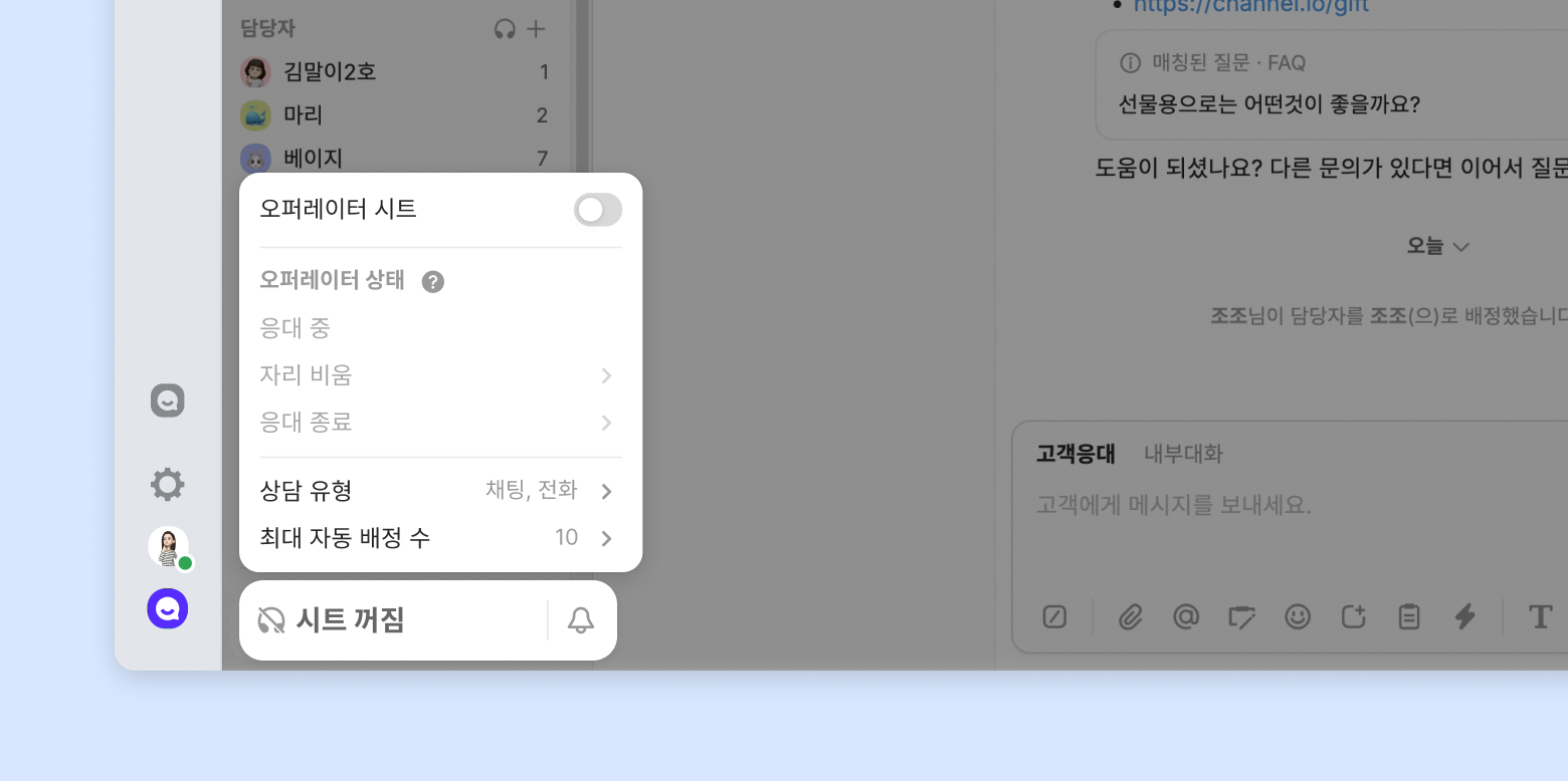 상담의 담당자가되어 전문적으로 상담을 진행하고 관리하기 위해서는 '오퍼레이터 시트'를 켜서 이용해야 합니다.
