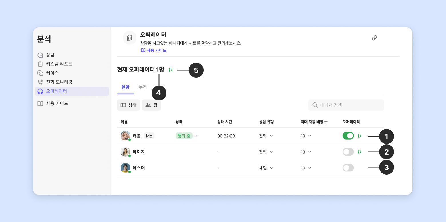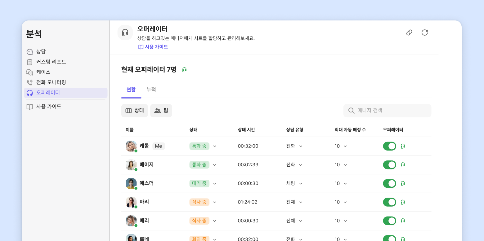 오퍼레이터 상태를 통해 팀 멤버의 상태와 상담 가능 여부를 한눈에 파악할 수 있어요.