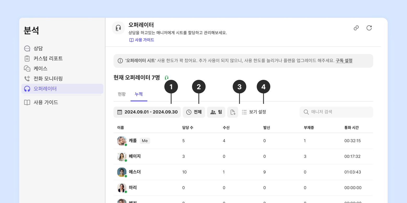 부재중 전화 | 설정한 기간동안 '담당자'로 참여한 부재중 전화 상담 수(부재중 수신 건만 포함) | 통화 시간 데이터 |