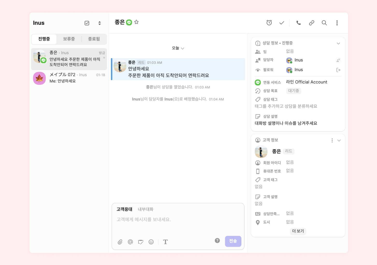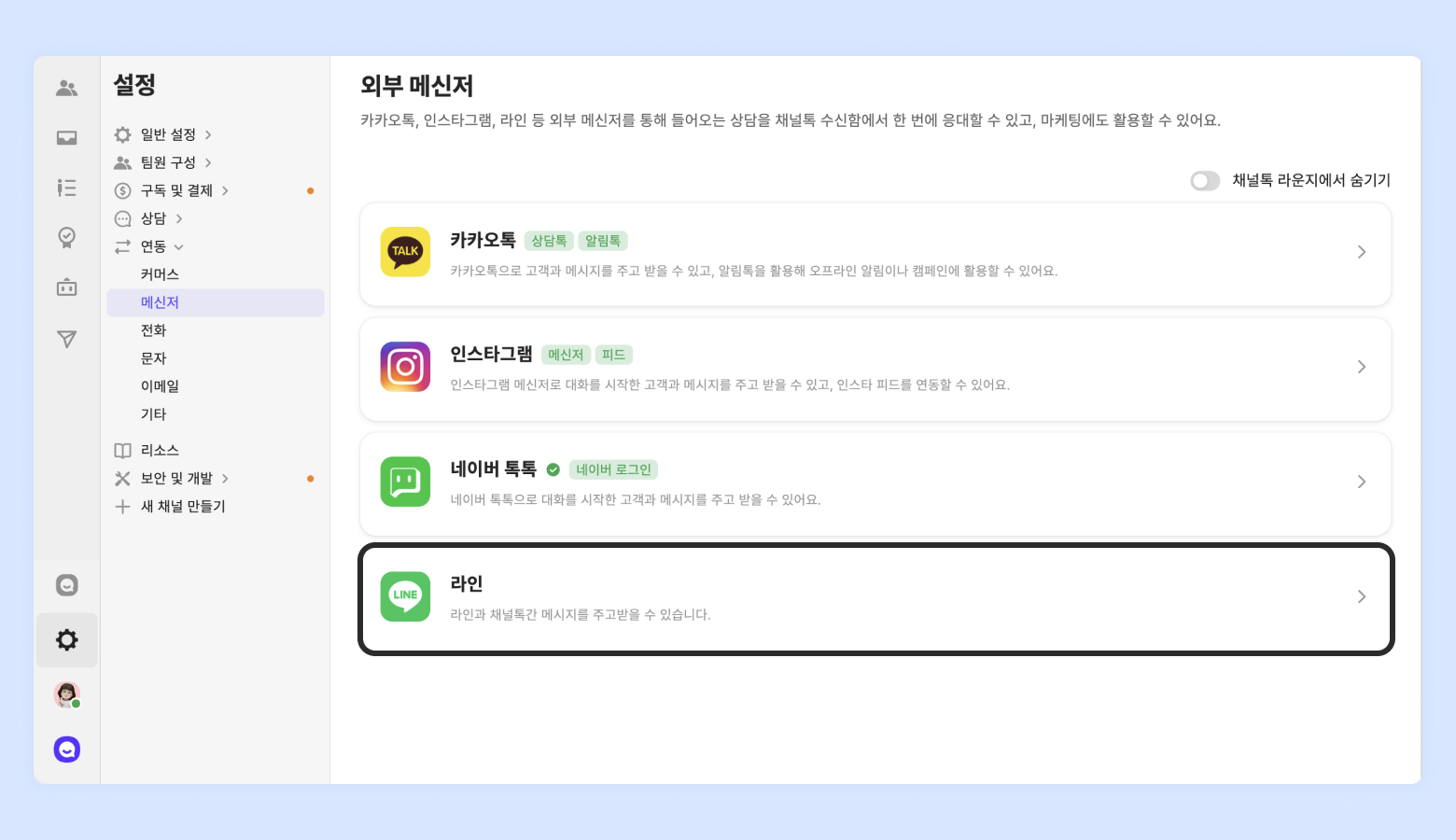 라인으로 인입된 문의를 채널톡에서 응대할 수 있습니다.