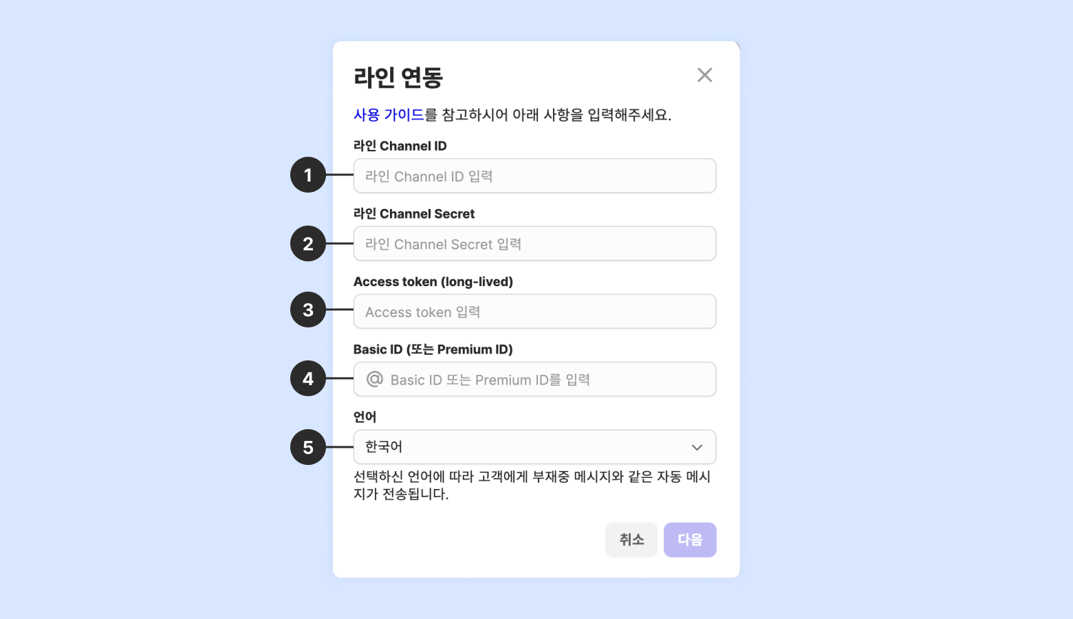 LINE Channel에서 확인한 아래 4가지 정보를 입력하고 언어를 선택해주시면 됩니다.