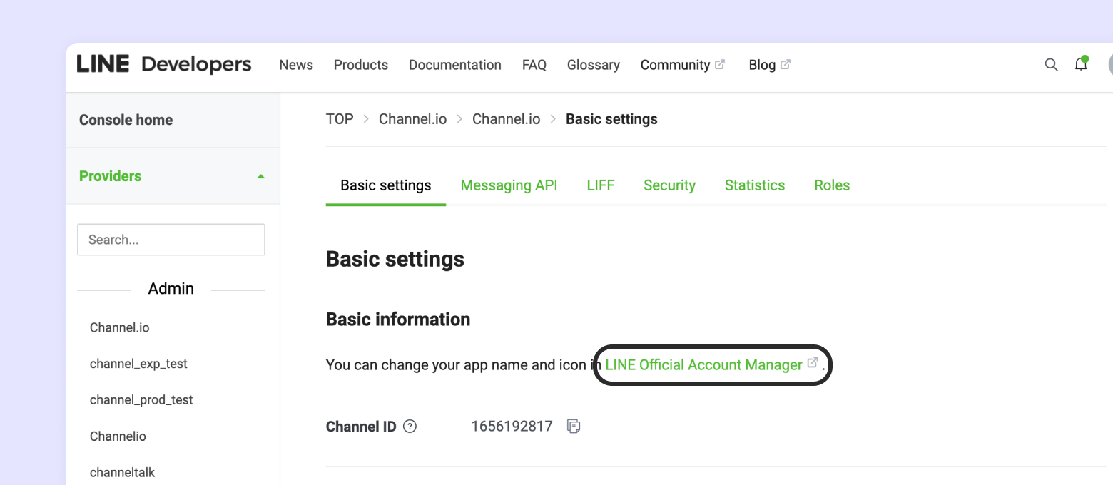 3. [Basic settings] 메뉴 탭에서[LINE Official Account Manager] 를 클릭하여 접속해주세요.