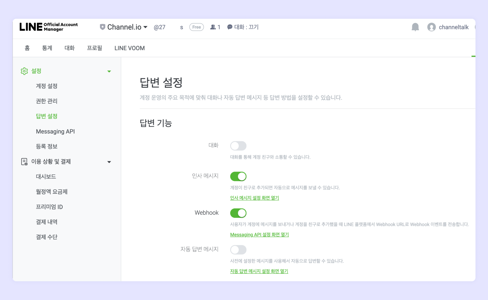 채널톡과 연동이 되면 LINE Official Account Manager 의 챗모드는 비활성화 돼요. 이전 상담 데이터는 조회가 어려우며, 챗모드를 활성화하면 연동은 끊어집니다.