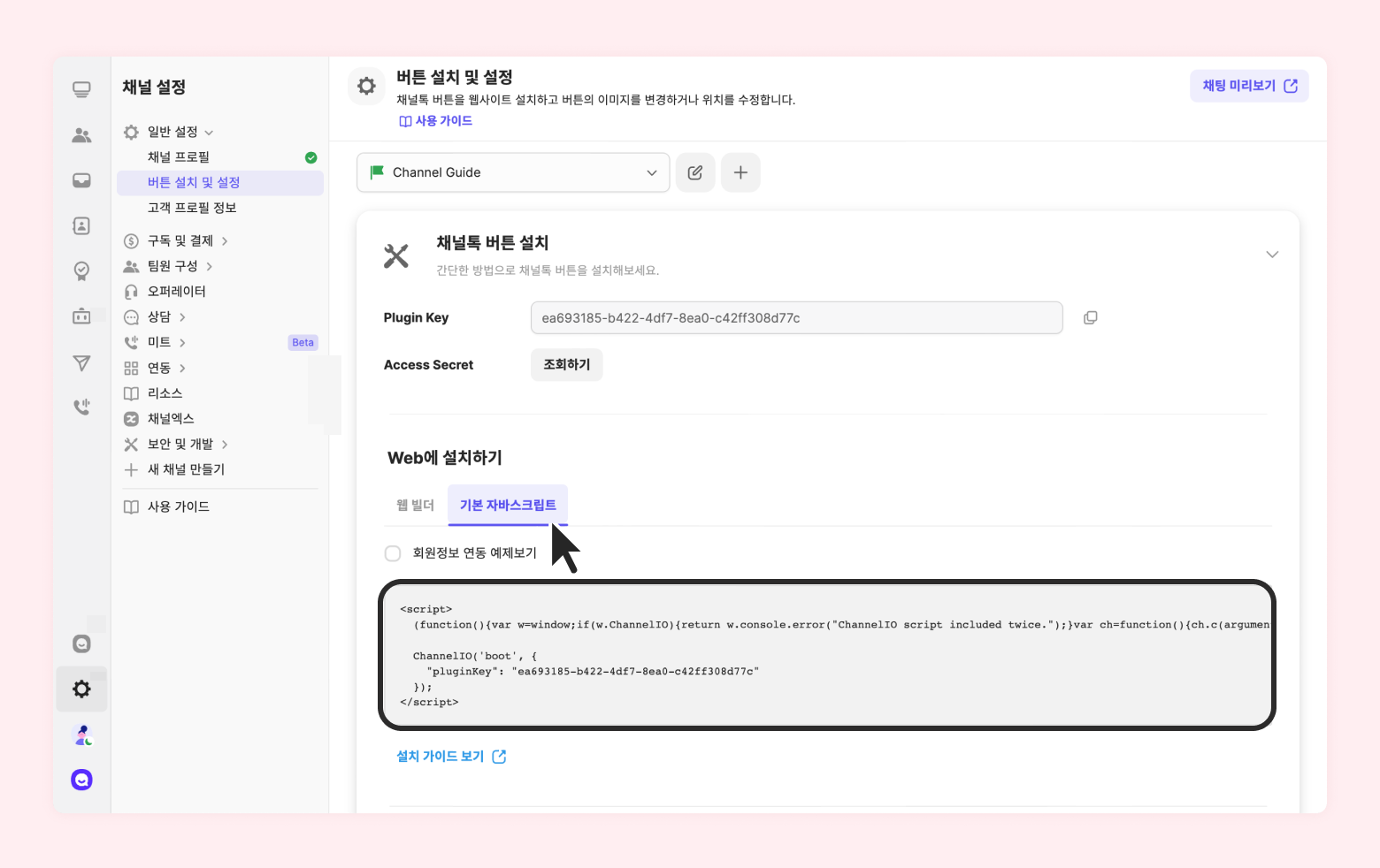 설치 스크립트는 [채널 설정] - [일반 설정] - [버튼 설치 및 설정] - [채널톡 버튼 설치] 에서 확인하실 수 있습니다.