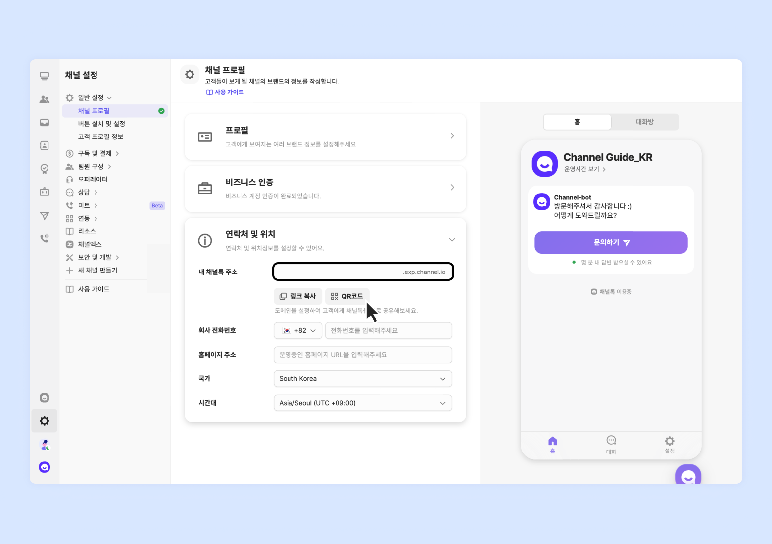 홈페이지가 없더라도, 채팅으로 바로 연결되는 내 채널톡 주소만 있다면 홈페이지 밖에서도 고객과 언제든지 대화할 수 있어요. [채널 설정] - [일반 설정] - [채널 프로필] - [연락처 및 위치] 에서 채팅 상담으로 바로 접속할 수 있는 URL을 복사할 수 있습니다.