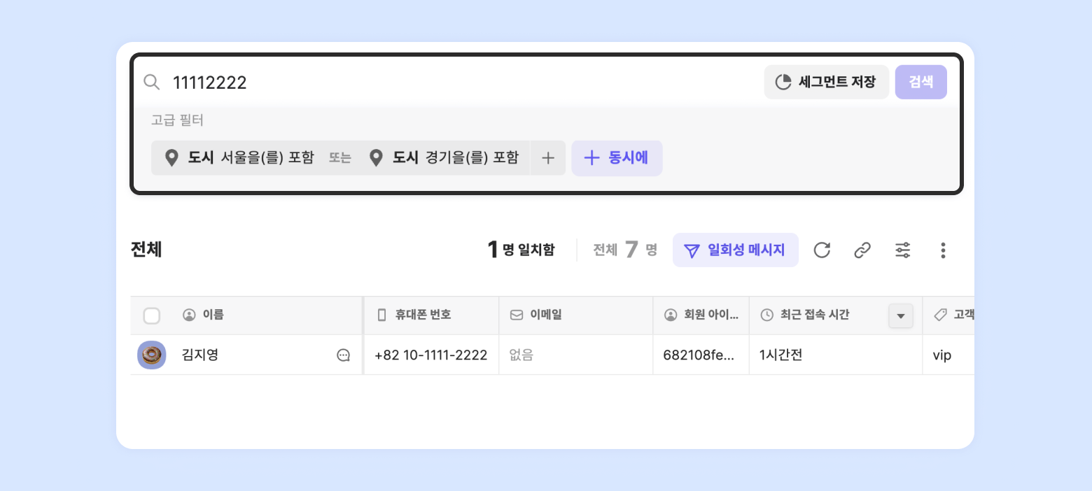 세그먼트란 원하는 필터링 조건을 그룹화하여 관리하는 기능이에요. 설정한 필터링 조건대로 언제든지 고객 목록을 불러오도록 세그먼트를 설정할 수 있습니다.