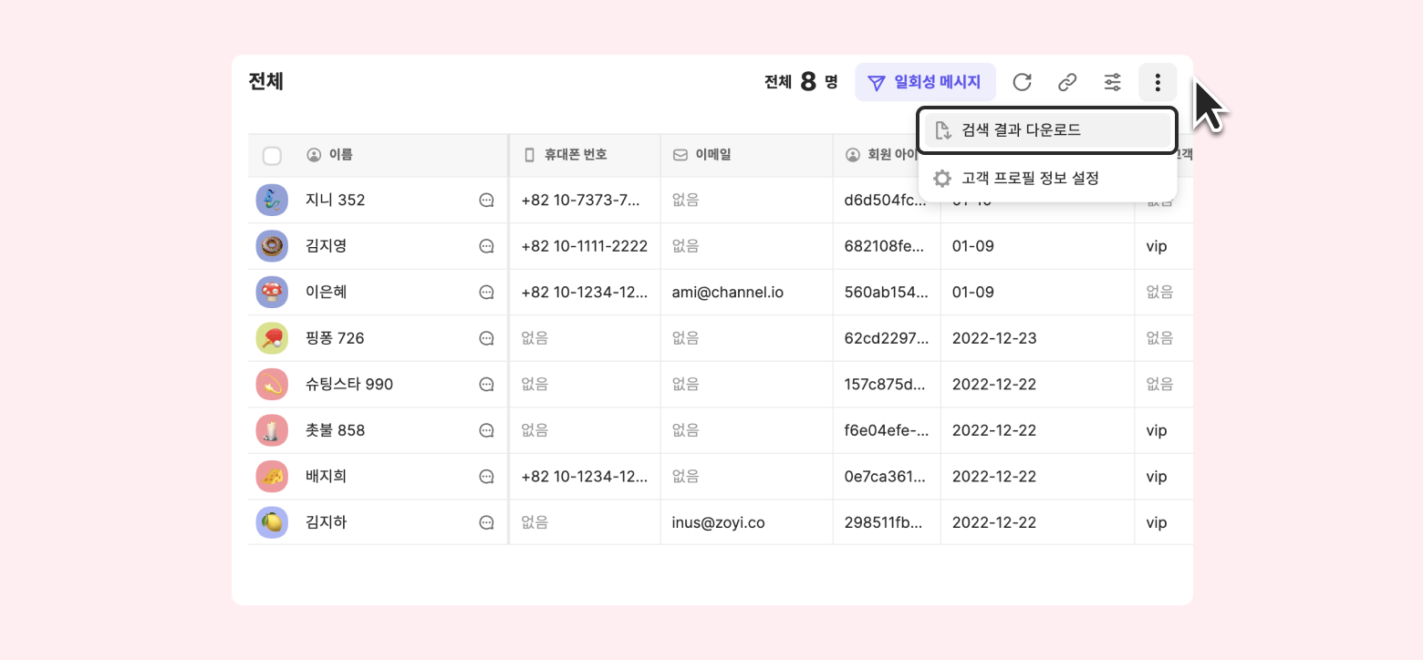 검색 결과 다운로드: 전체 고객 또는 필터링한 결과를 다운로드 할 수 있습니다. (→ 자세히 보기)
