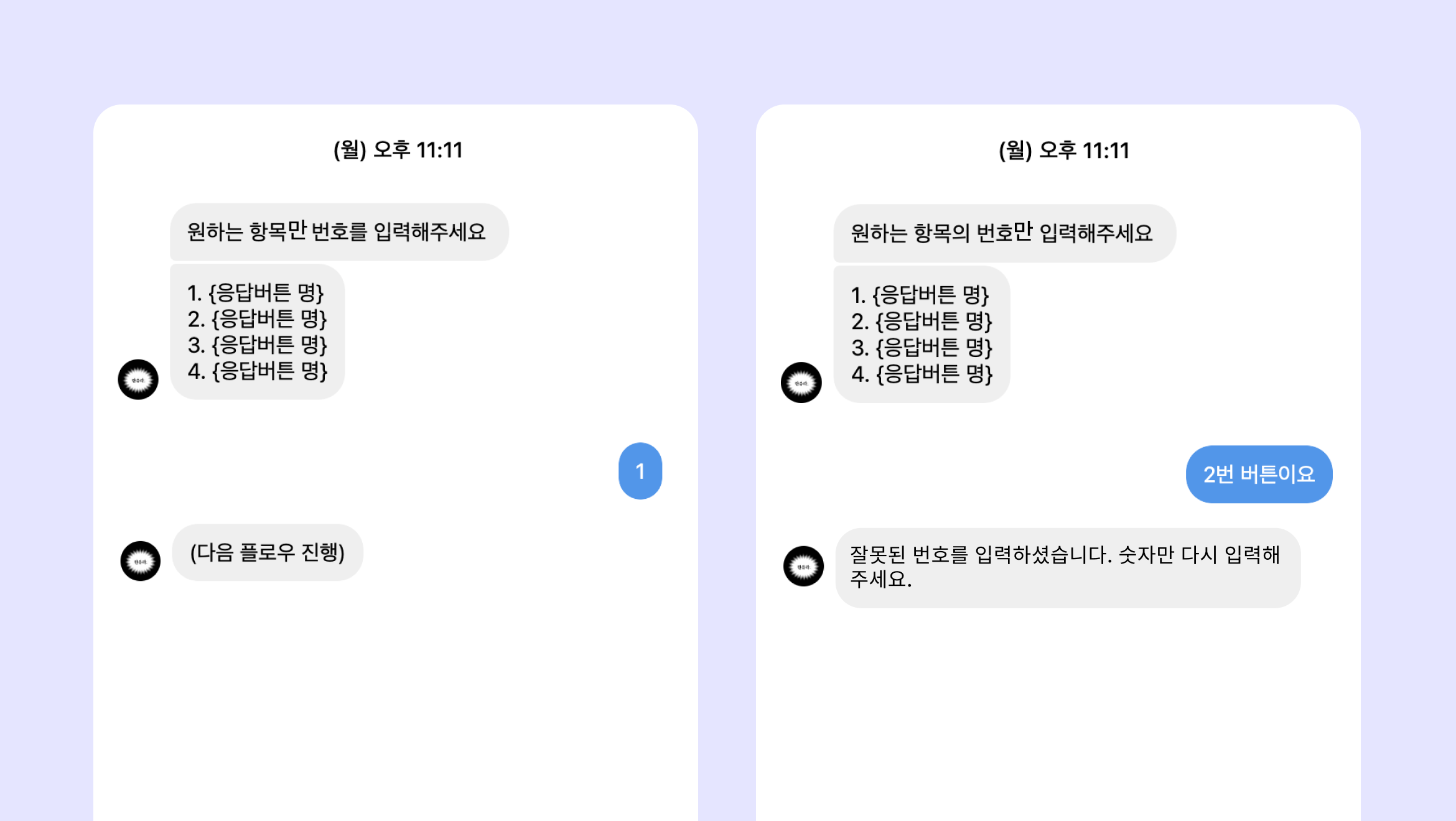 번호가 아닌 값이 입력하게 되면 “잘못된 번호를 입력하셨습니다. 숫자만 다시 입력해 주세요.” 에러 메시지 발송 후 다시 입력을 대기합니다.
