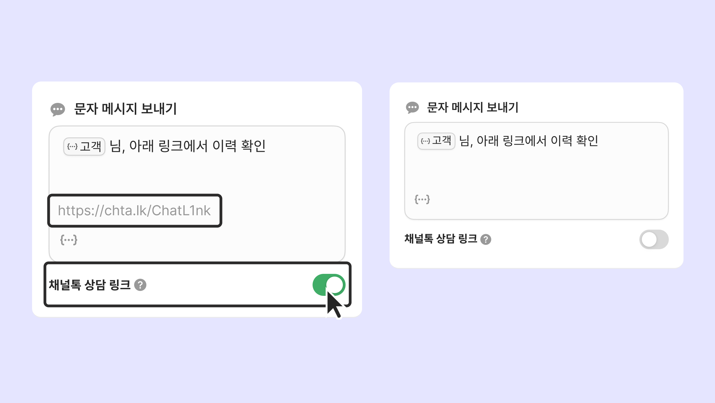 채널톡 상담 링크가 아닌 다른 링크를 보내고 싶은 경우 채널톡 상담 링크 off하고 원하는 링크를 문자 메시지 본문에 추가해 주세요.