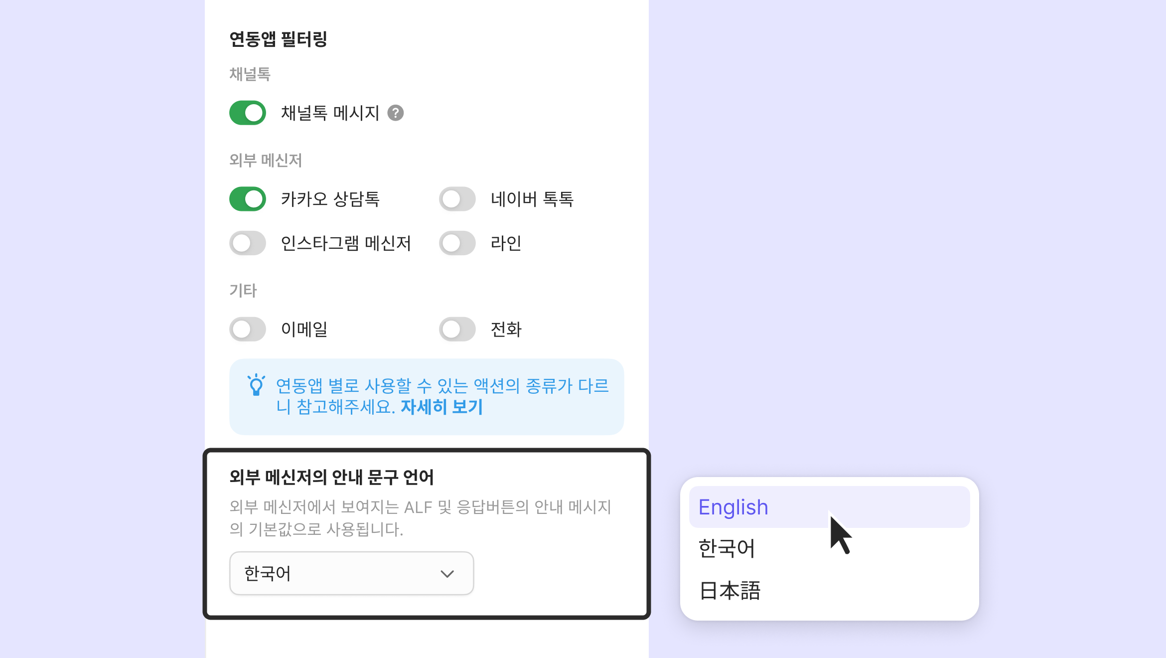 외부 메신저에서 고객에게 보여지는 언어는 워크플로우의 언어로 보여지며, ALF 답변이나 응답 버튼의 시스템 메시지는 영어, 한국어, 일본어로 제공됩니다. 워크플로우 트리거 언어 설정에서 고객의 언어에 맞게 설정해 더욱 자연스러운 상담 경험을 제공할 수 있어요.