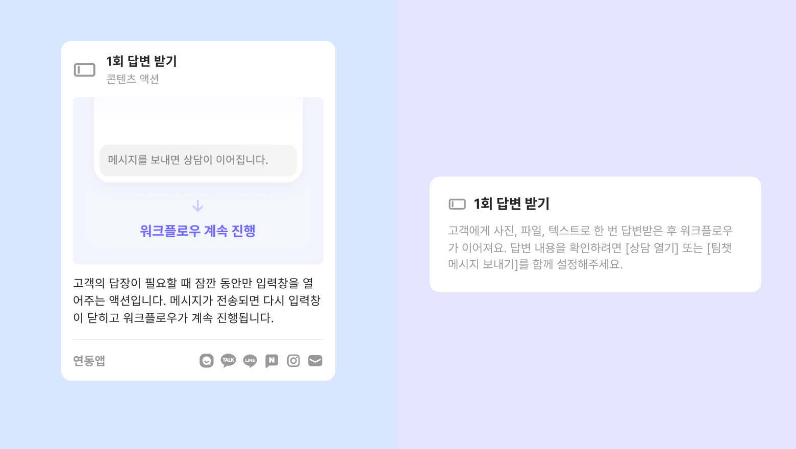 2025년 1월 2일부터 [고객 응답 받기] 액션 이름이 [1회 답변 받기]로 변경되었습니다. 액션 명칭만 변경된 것으로, 기존에 설정하신 워크플로우에는 영향을 미치지 않습니다.