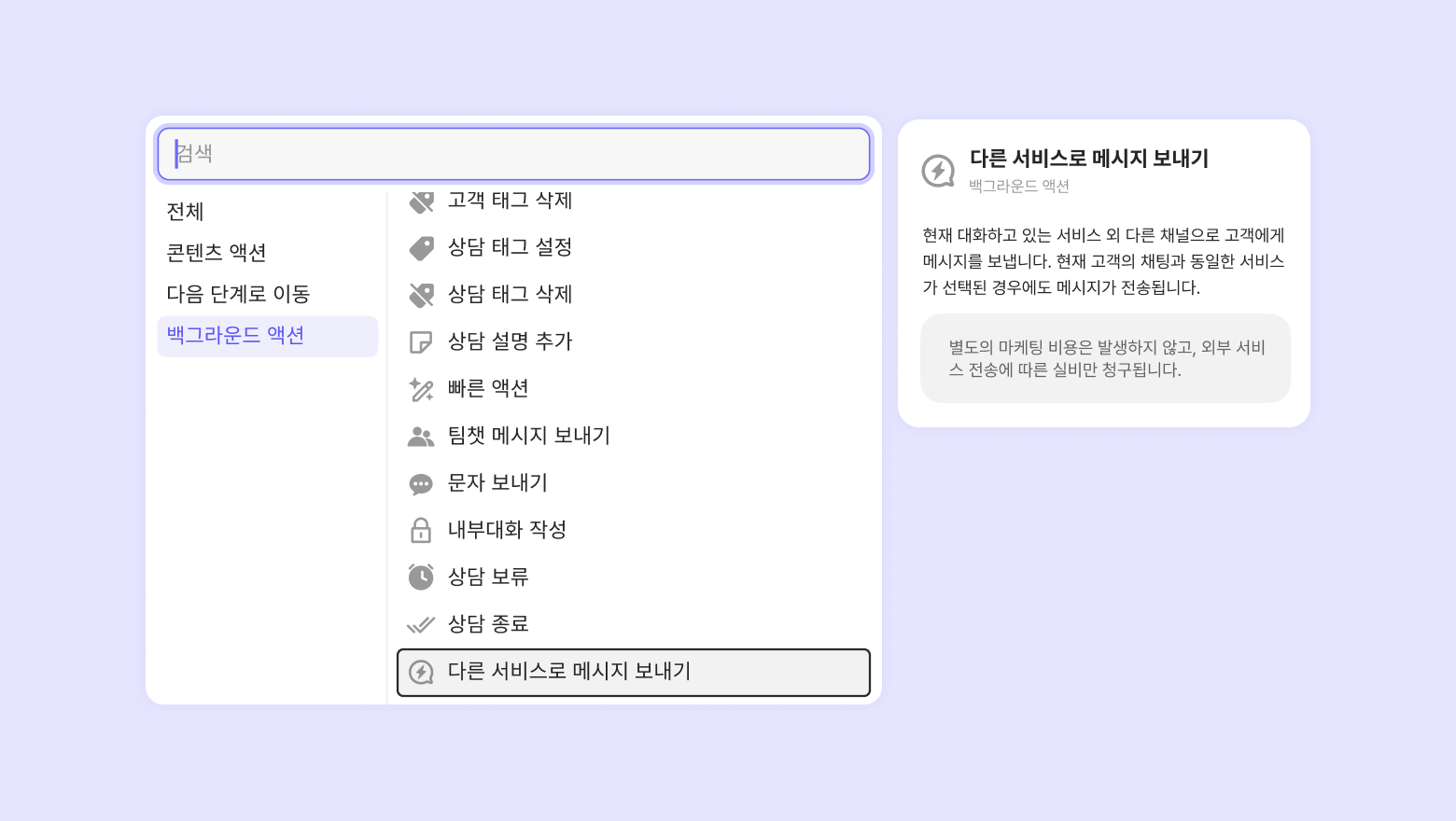 브랜치 문자 보내기 담당자 배정 / 비우기 팀 배정 / 비우기 팔로워 설정 / 비우기 상담태그 설정 / 삭제 고객태그 설정 / 삭제 상담 보류 상담 열기 상담 종료 우선순위 설정 | 응답 버튼 입력폼 보내기 메시지 보내기 내부 대화 작성 1회 답변 받기 빠른 액션 AI 에이전트(ALF) 응대 상담 설명 추가 팀챗 메시지 보내기 |