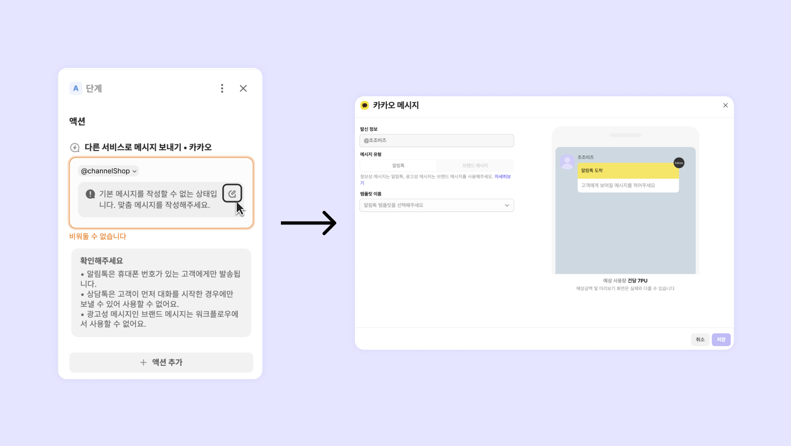 [채널 설정] - [연동] - [앱스토어]에서 카카오 [알림톡] 연동이 완료되었다면, '다른 서비스로 메시지로 보내기' 액션을 사용하여 알림톡을 자동으로 보낼 수 있어요. (→ 카카오 연동방법 알아보기)
