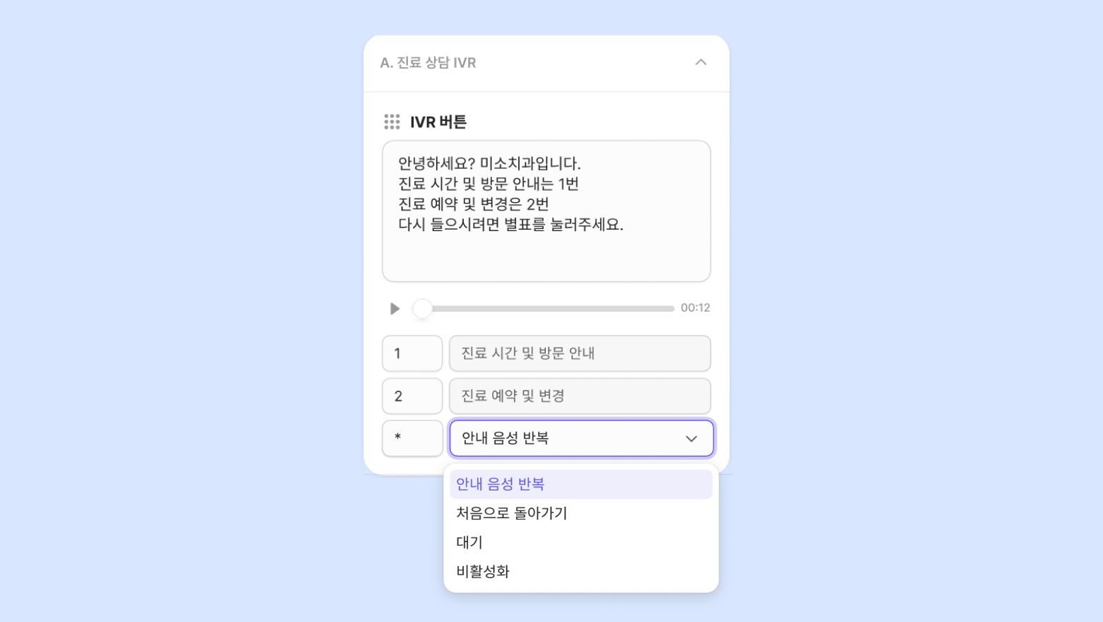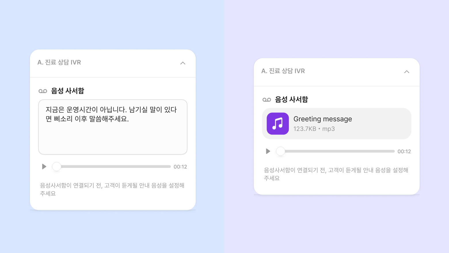 운영 시간 안내/ 미운영 시간 안내에 따라 다른 음성 메시지를 설정할 수 있어요.