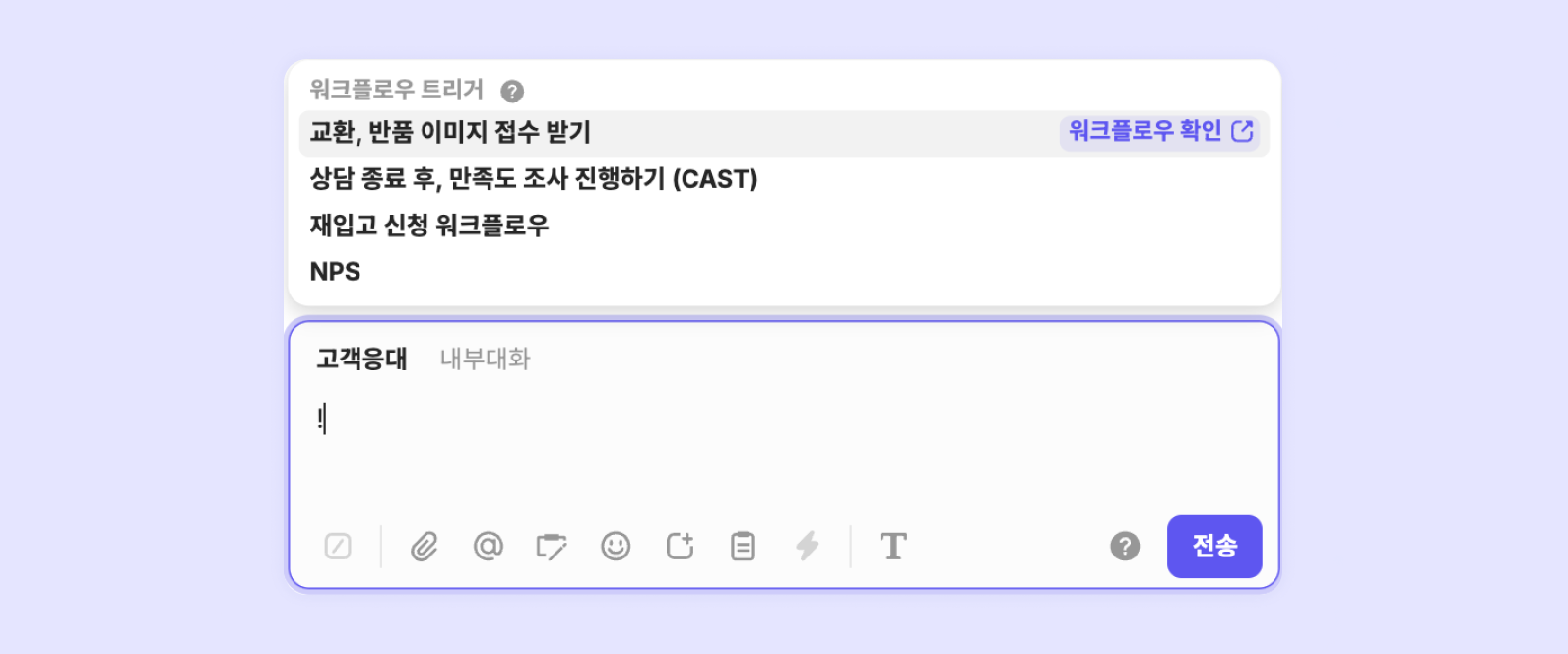 상담이 종료되고 나면 고객 만족도 조사 및 피드백을 모듈형 워크플로우로 전달할 수 있어요.