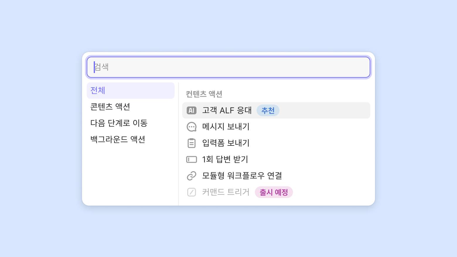 콘텐츠 액션 | 고객 ALF 응대 | - 단계 연결 액션(응답 버튼, 브랜치) 과 같이 쓸 수 없어요. | 전화, 이메일를 제외한 모든 앱 |