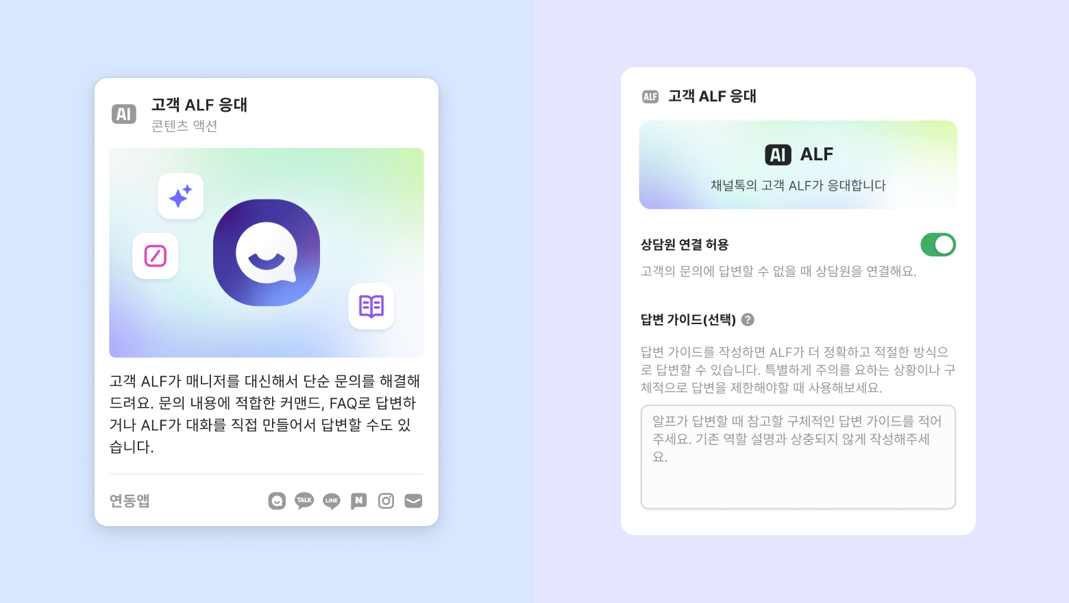 고객 ALF가 상담을 응대합니다. ALF가 먼저 고객과 대화 후 문제가 해결되지 않았다면 상담으로 연결할 수 있어요. (→ ALF 더 알아보기)