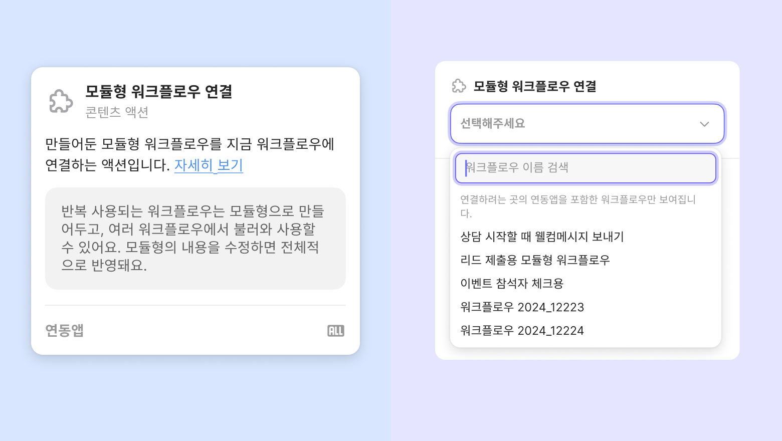 모듈형 워크플로우 연결 | 호출하려는 워크플로우의 연동앱이 모듈형 워크플로우의 연동앱 포함해야 연결할 수 있어요 | ||