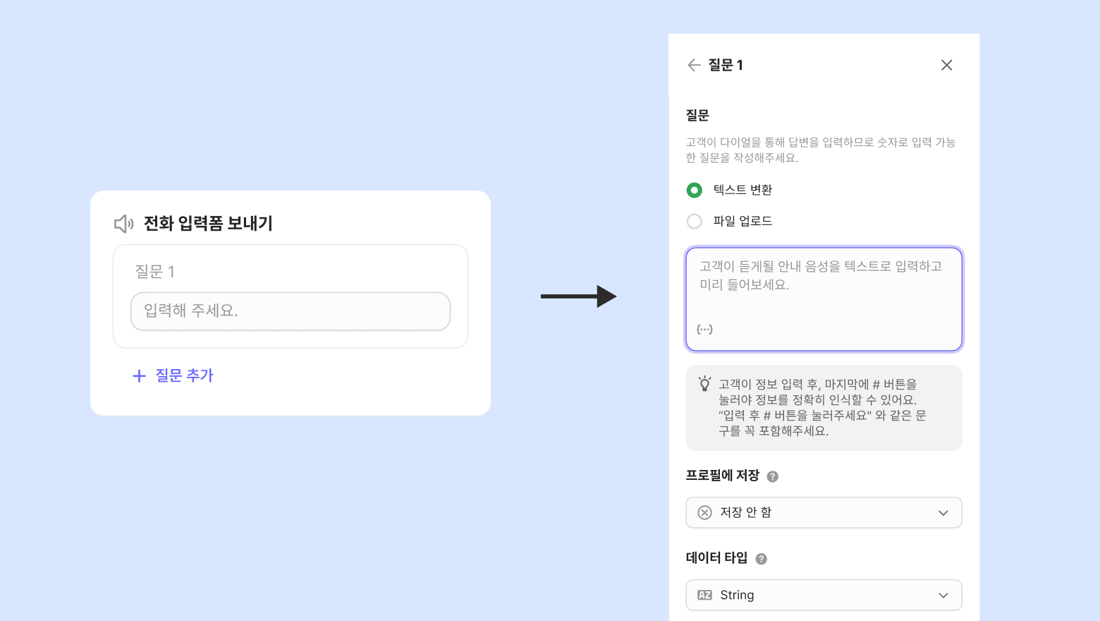 음성 메세지는 텍스트 변환, 파일 업로드 2가지 타입으로 설정할 수 있습니다.