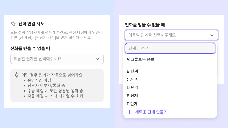 전화 연결 시도 | 배정한 담당자/팀이 전화를 받지 못하는 경우 끊지 않고 다른 담당자/팀으로 전화를 재배정 할 수 있어요. | 전화만 가능(IVR 전용) | |