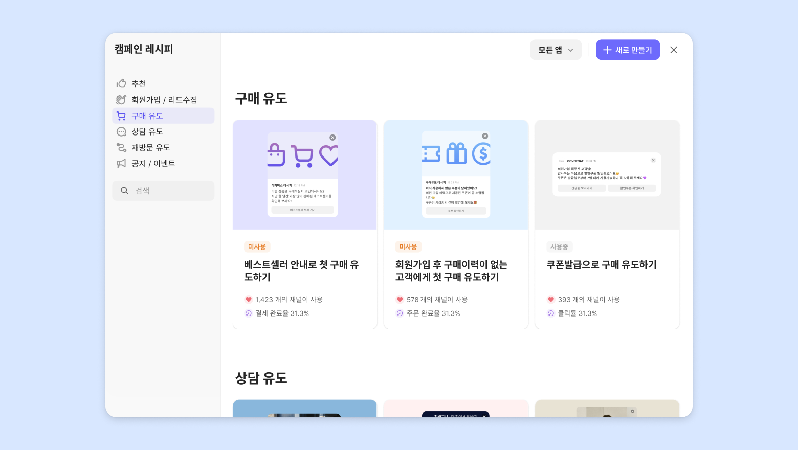 마케팅 캠페인을 처음 설정하신다면, 레시피를 활용해 손쉽게 시작해 보세요.