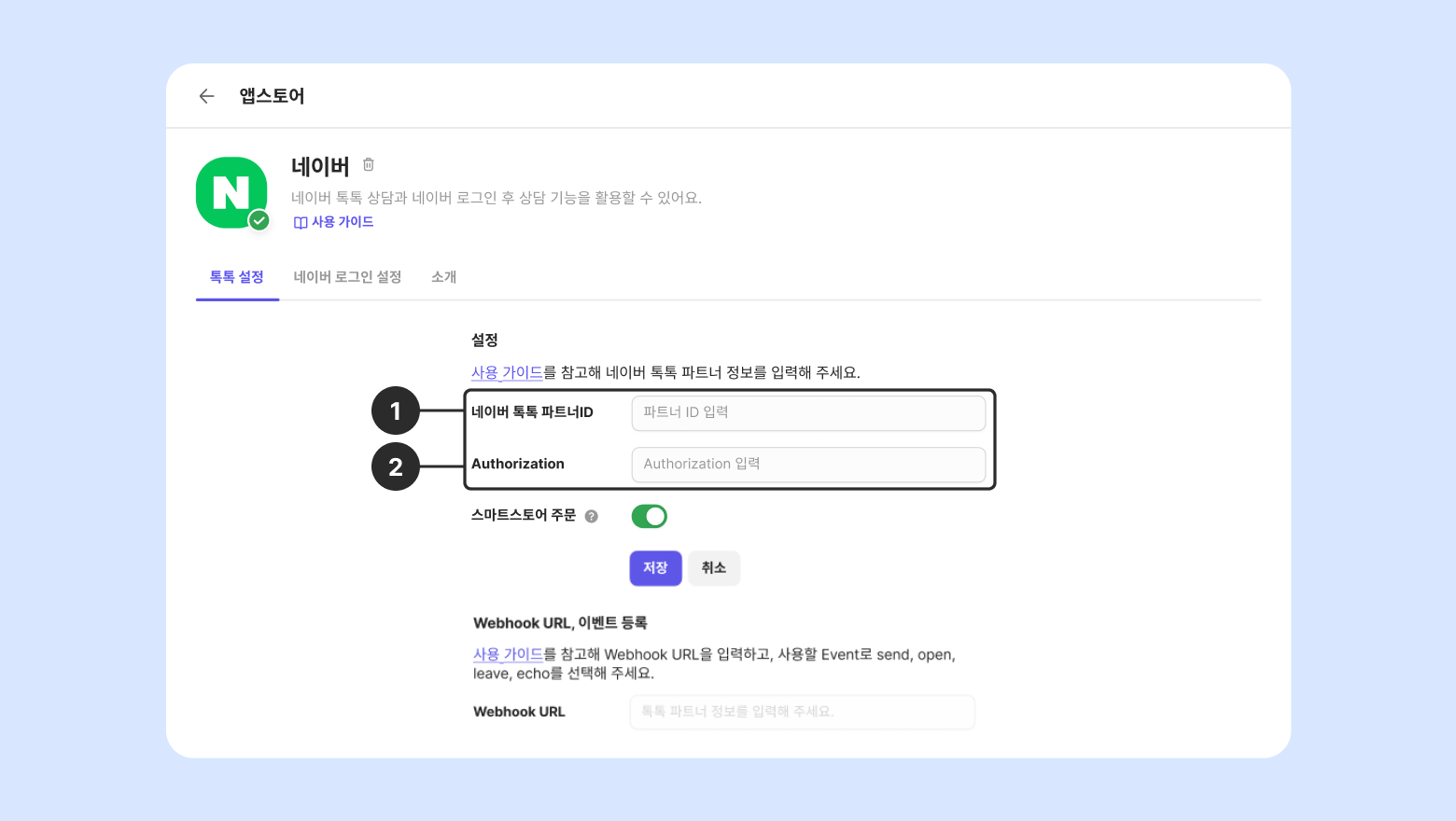 네이버 톡톡 파트너 센터 에서 확인한 정보를 채널톡 화면에 입력하고 [저장] 을 눌러주세요.