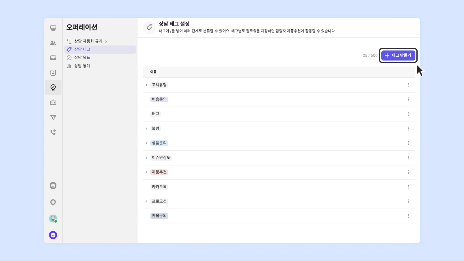 설정 경로: [오퍼레이션] - [상담 태그] 에서 상담 태그 추가 및 관리