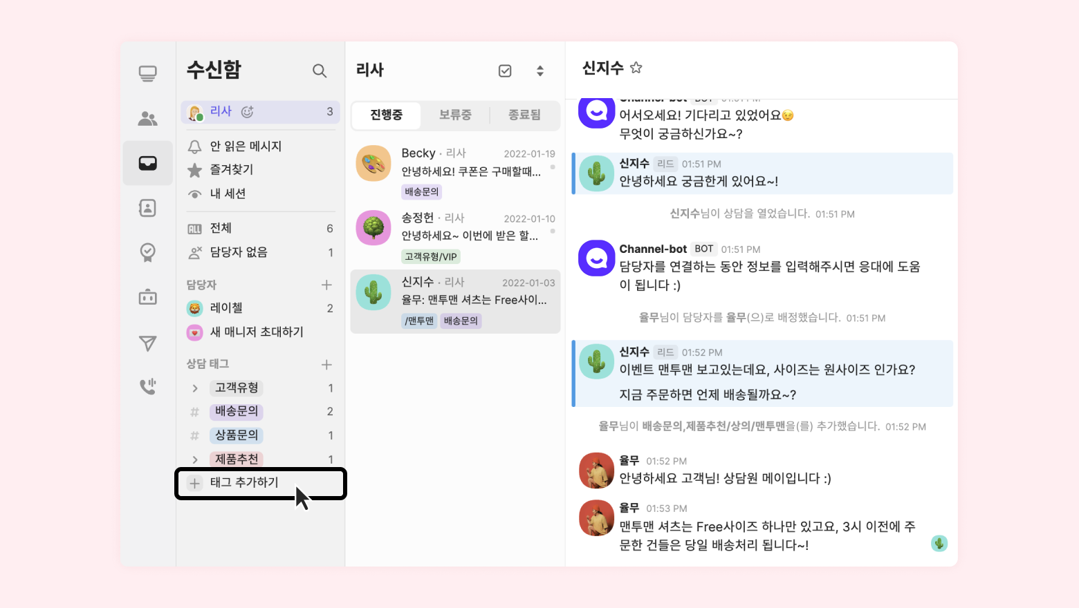 수신함 좌측 하단과, 상담 목록에는 태그가 보이지 않아요.