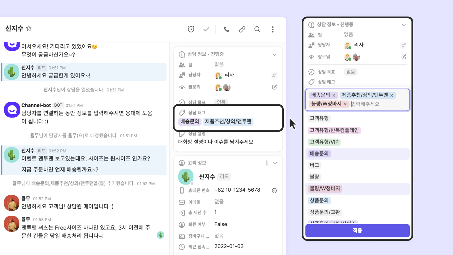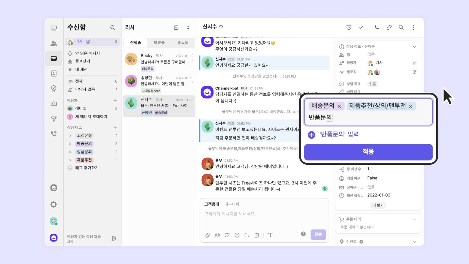하나의 상담에 다양한 문의를 남겨도, 여러 태그(멀티 태그)를 달아 문의 내용을 빠짐없이 분류할 수 있어요.