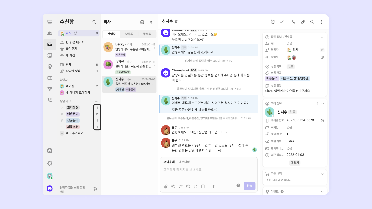 수신함에서 현재 진행중인 상담의 수를 태그 별로 확인할 수 있습니다.