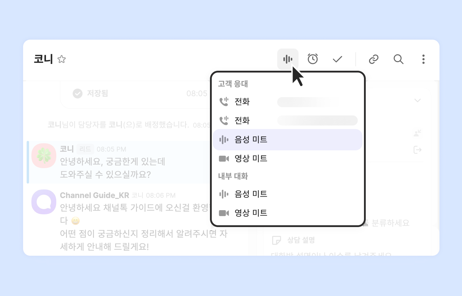 담당자가 있는 상담 안에서 음성 미트, 영상 미트가 가능하기에 진행 중인 채팅이 유지됩니다.