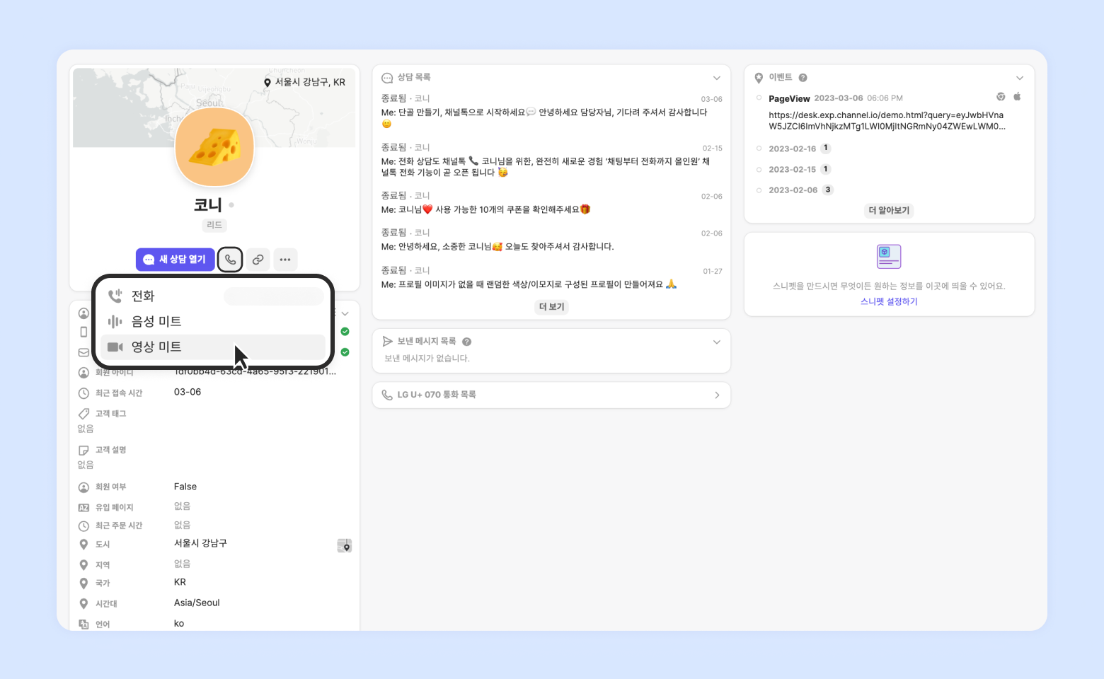 또한 고객 프로필 상세 화면에서도 [미트] 버튼을 눌러 새 상담으로 미트를 열 수 있습니다.