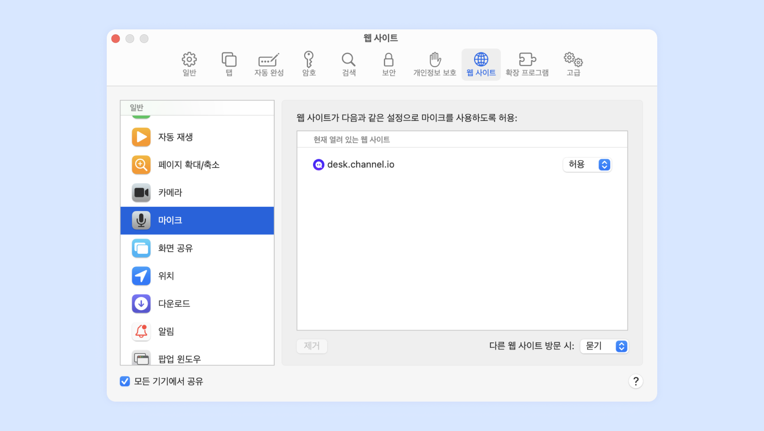 [웹사이트] - [카메라], [마이크]에서 각각 채널톡 주소 (desk.channel.io)에 대해서 권한 허용을 해주세요.