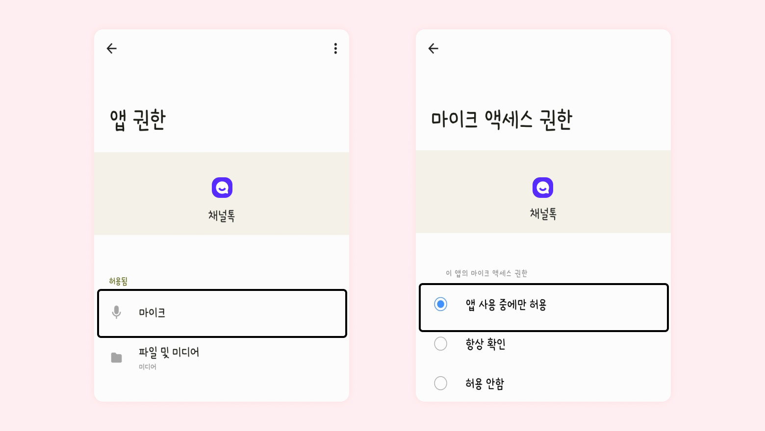 [마이크], [카메라]에서 각각 Channel Talk의 권한을 허용해주세요