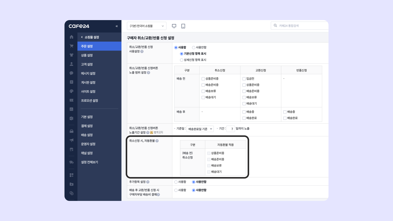 카페24 어드민 상 위치 : [쇼핑몰 설정] - [주문 설정] - [주문 후 설정] - 입금/환불/반품처리 설정 내 ‘취소/반품 시 자동 수량 복구’