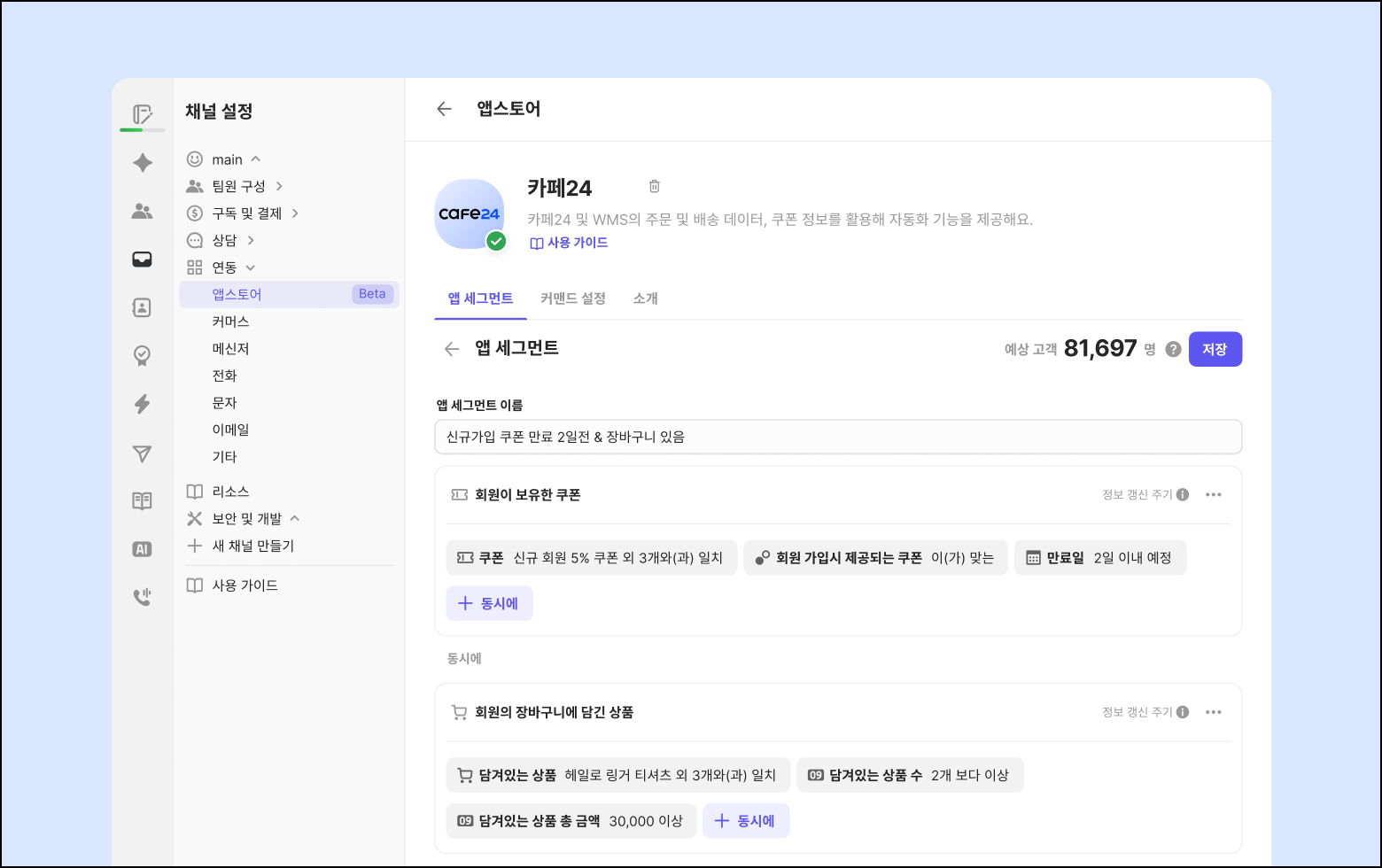 경로: [채널 설정] → [연동] → [앱스토어] → [카페24] → [앱 세그먼트]