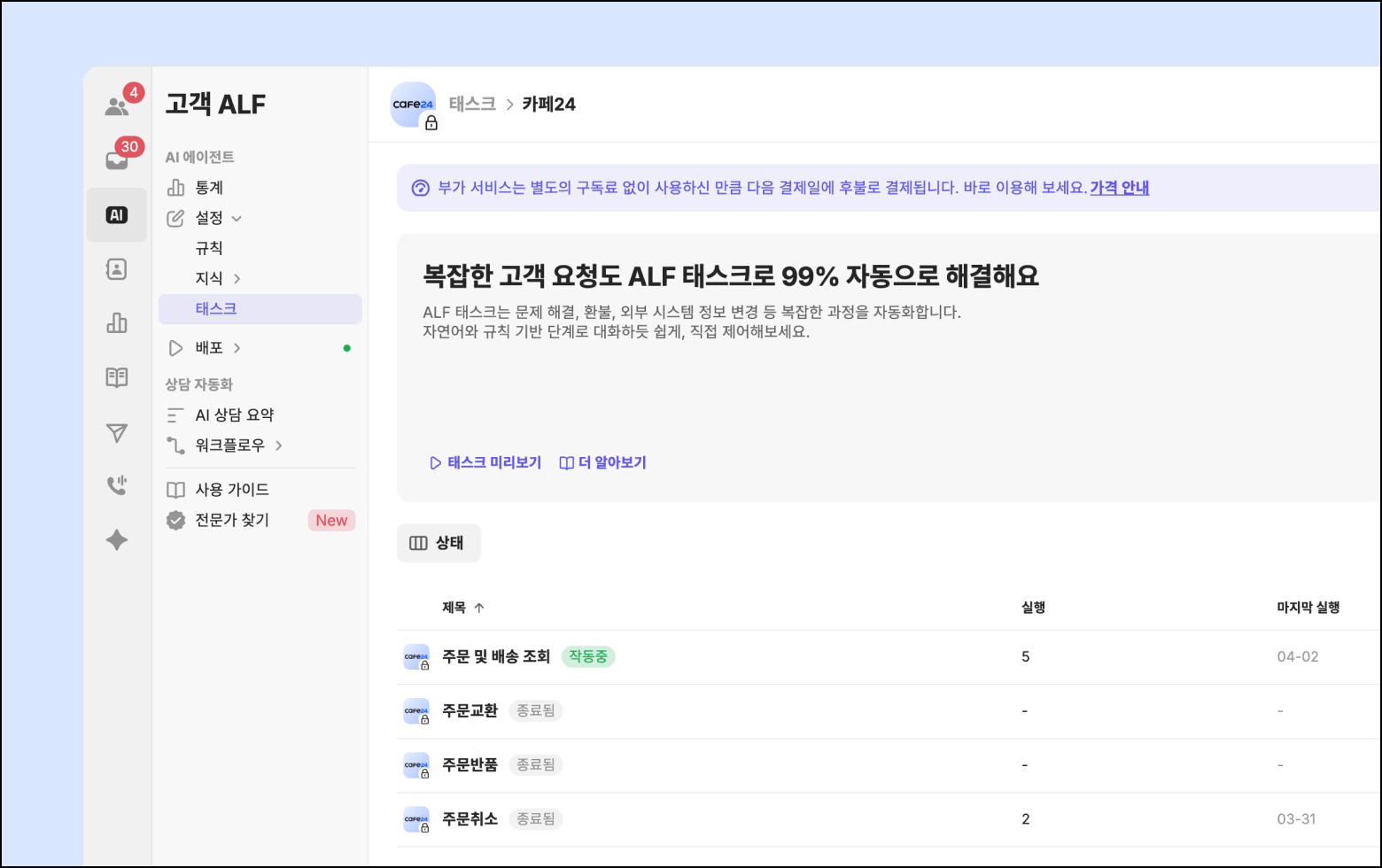 상담 중 고객이 [주문 및 배송 조회, 주문취소]를 요청하면 ALF가 태스크를 자동 실행하며 대화형으로 업무를 처리합니다.