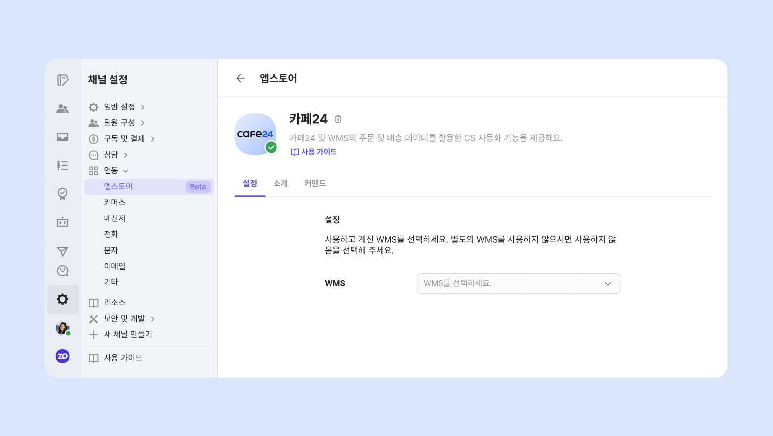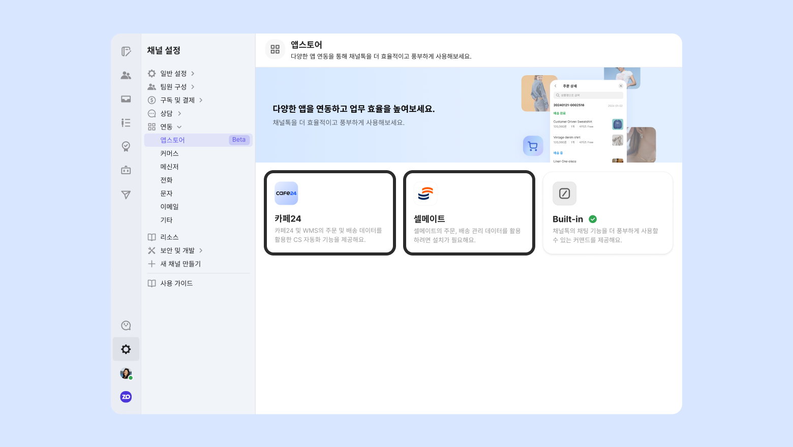 [채널 설정] - [연동] - [앱스토어]에서 아래의 앱을 설치해 주세요.
