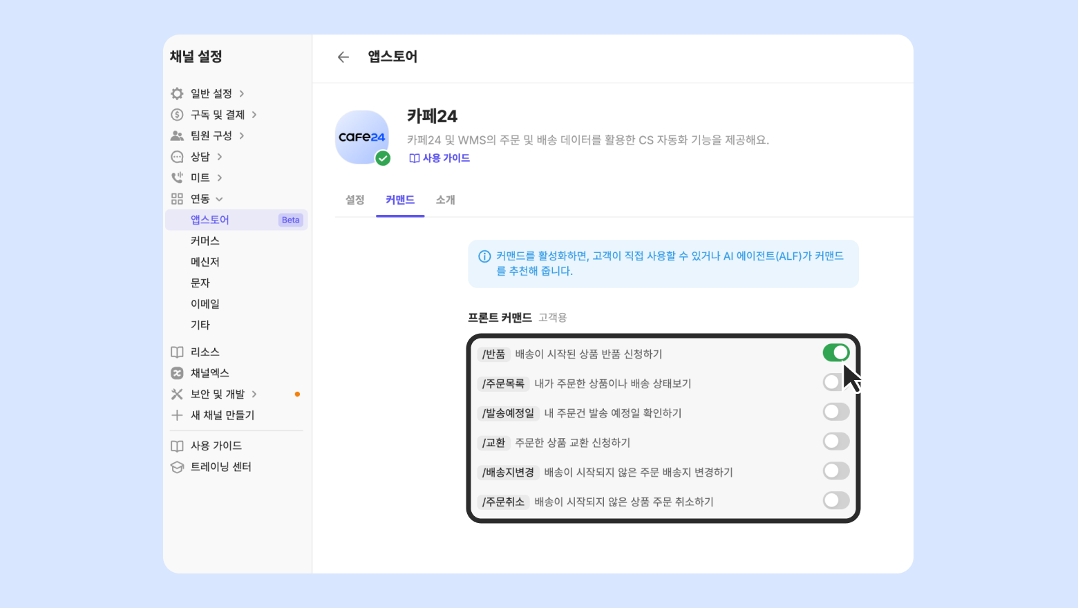 커맨드는 카페24 쇼핑몰 데이터와 WMS(물류관리시스템) 재고 데이터를 채널톡과 연동하여, 고객에게 주문 정보(주문 취소, 주문 목록, 발송 예정일 등)를 제공하는 기능이에요. 상담원도 주문 관련 단순문의 응대를 줄일 수 있고, 고객도 쉽게 주문 내용을 확인할 수 있어요.