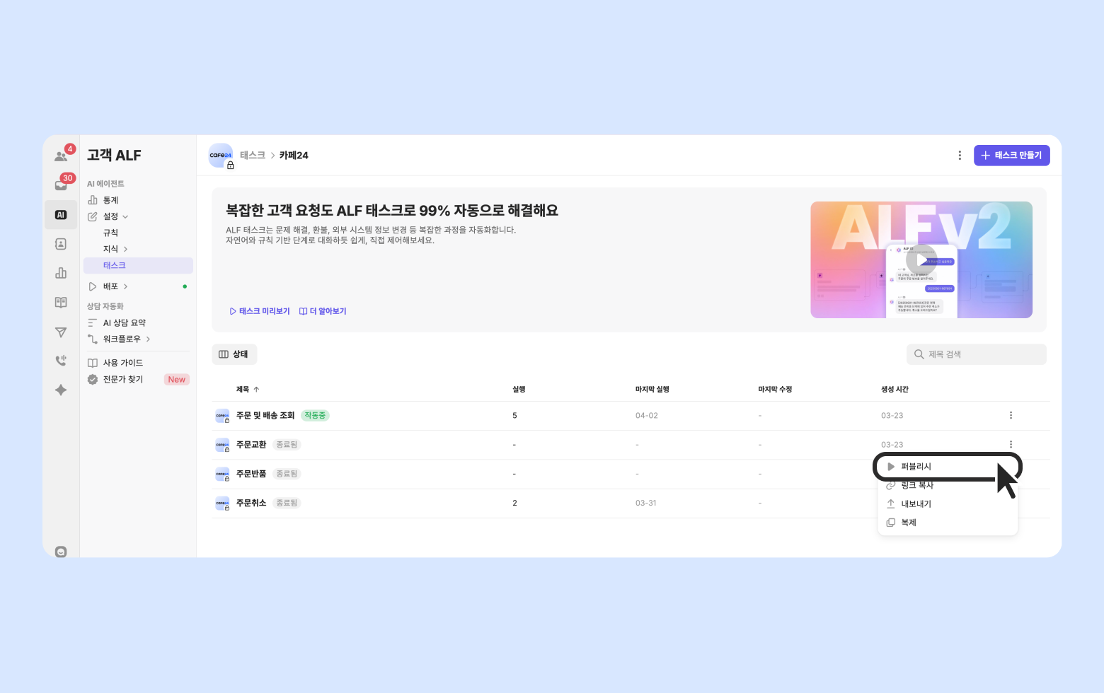 태스크는 ALF 응대 시 고객이 자주 요청하는 특정 업무를 자동화된 흐름으로 처리할 수 있도록 만든 기능입니다. 태스크를 통해 단순 질의응답을 넘어 대화형으로 실제 업무 처리까지 가능합니다.