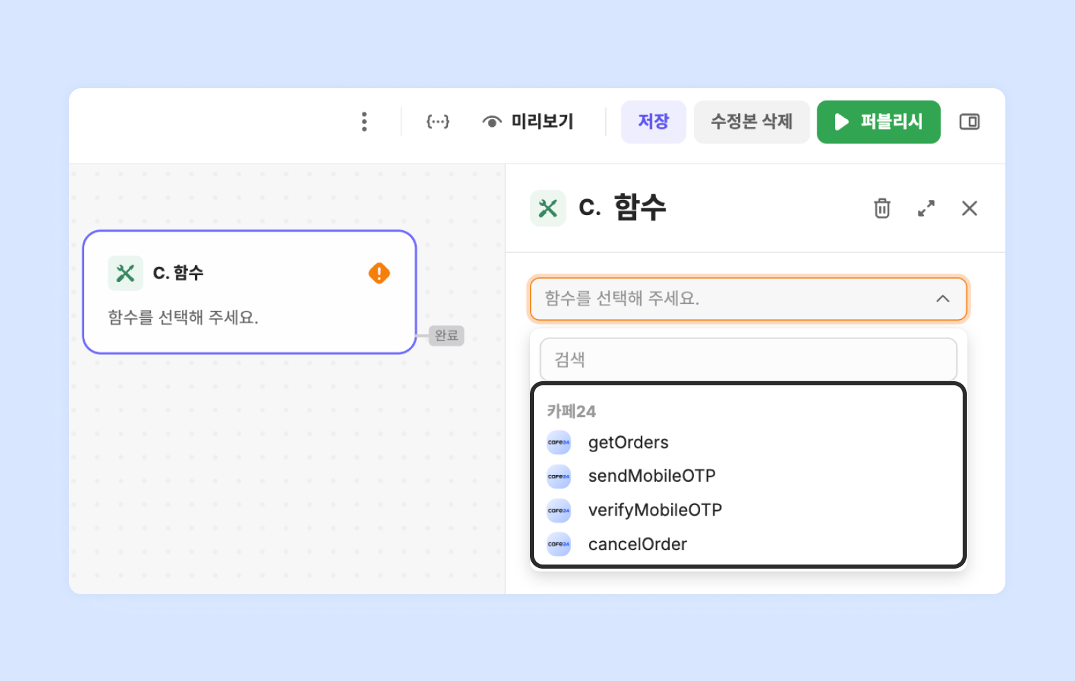 태스크 설정 화면에서 '함수'를 클릭하여 단계를 추가하세요.